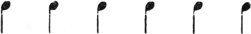 Für den Gesichtssinn gilt das gleiche. Wird eine Anzahl unzusammenhängender Linien, Punkte, Ziffern oder Buchstaben dem Auge in Bruchteilen einer Sekunde gezeigt und dann schnell wieder verdeckt — genaue Versuche ermöglichen die verschiedenen Arten der Schnellseher[7] (Tachistoskope) —, so zeigt sich, daß Ungeübte 3–4, Geübte dagegen 6 einzelne Linien, Punkte, Ziffern, Buchstaben klar und deutlich gleichzeitig erfassen können. 6 Einheiten vermag die Aufmerksamkeit also beim Gesichtssinn gleichzeitig zu umfassen. Beim Gehör arbeitet sie in ähnlicher Weise. 6 getrennte Schalleinheiten, etwa Taktschläge, umfaßt sie auch nacheinander, nur muß auf strenge Sonderung der einzelnen Schläge geachtet werden.