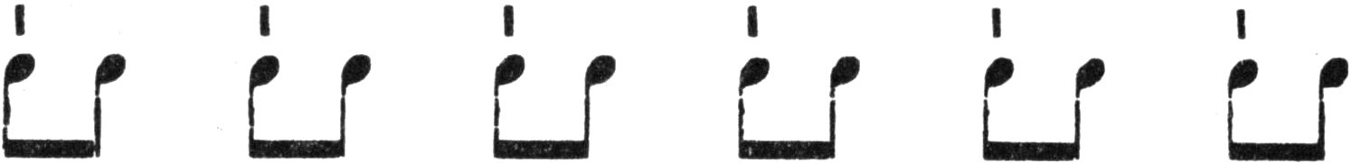 Beim Gesichtssinn gleichzeitiges Umfangen mit der Aufmerksamkeit (simultan), beim Gehörssinn nacheinander (sukzessiv) — es bleibt das gleiche Ergebnis: Höchstens 6 voneinander[S. 13] getrennte Einheiten umspannt die Aufmerksamkeit. Wir wollen uns durch folgenden einfachen Versuch selbst davon überzeugen. Wir lesen einer andern Person ohne Taktgliederung (!) und ohne Betonung (!) folgende Silben vor: