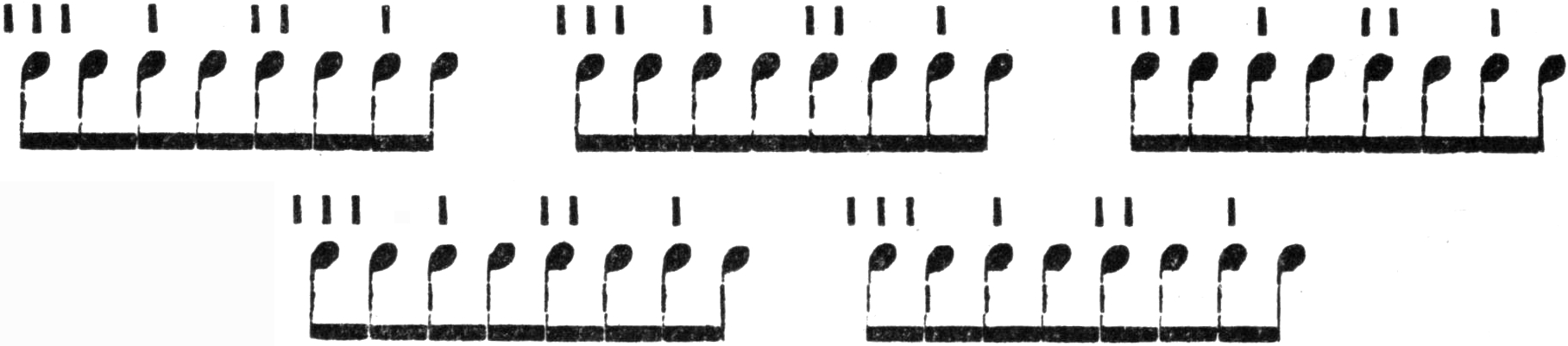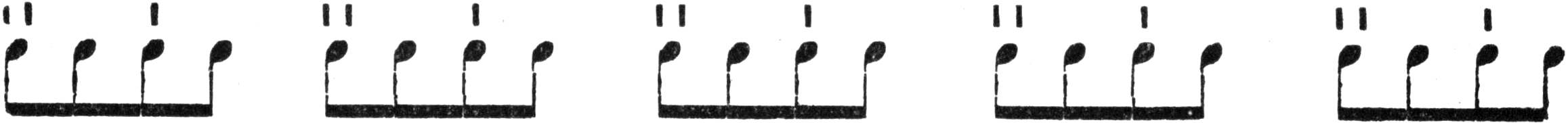 Die Macht der Gliederung aber erkennen wir so recht aus den Versuchen Wundts. Mit Klopfapparaten, die auf bestimmte Schläge Nachdruck legen, z. B. beim ⁴⁄₄-Takt auf den ersten stark, auf den dritten nicht so stark, auf den zweiten und vierten Schlag schwach klopfen, läßt sich bei einiger Übung feststellen, daß die Aufmerksamkeit umfassen kann (der Nachdruck wird durch Striche über der Note angezeigt):