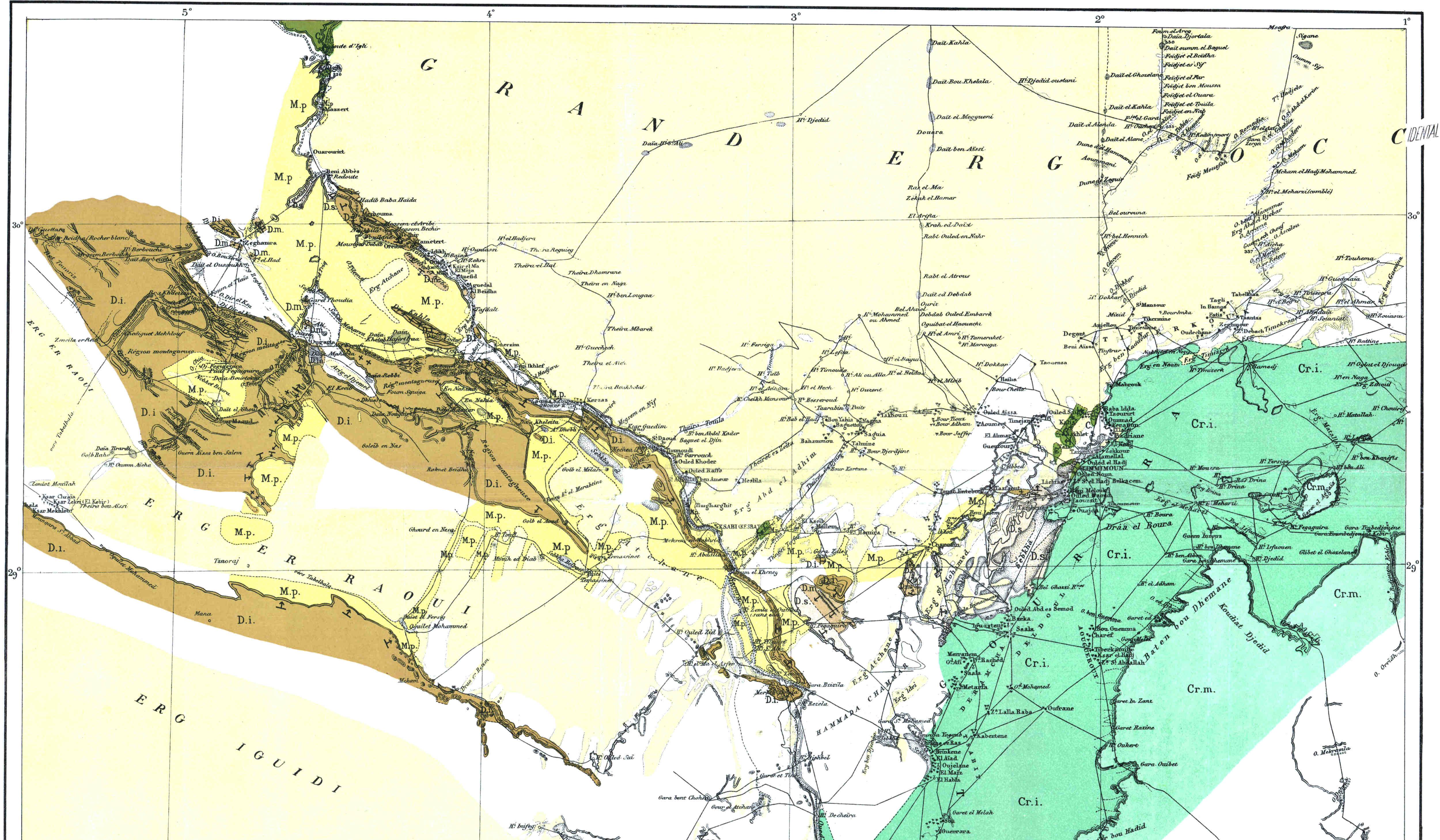 | Les sols (hammada — reg — erg — sif — feidj ou gassi — nebka. — Sol de Timchent), 3. — Forme du terrain (gara — baten et kreb — moungar, tarit — chebka), 8. — Hydrographie (l’oued — sebkha et chott — maader — haci — aïn — r’dir ou aguelman — tilmes abankor — medjbed — tanezrouft), 10. | |
