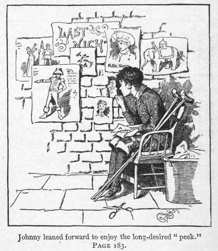 These were Johnny's pleasures: but he had two sorrows,—one, a very real one, his aching back; and the other, a boyish longing to climb the wall and see what was on the other side, for it seemed a most wonderful and delightful place to the poor child, shut up in that dismal court, with no playmates and few comforts.