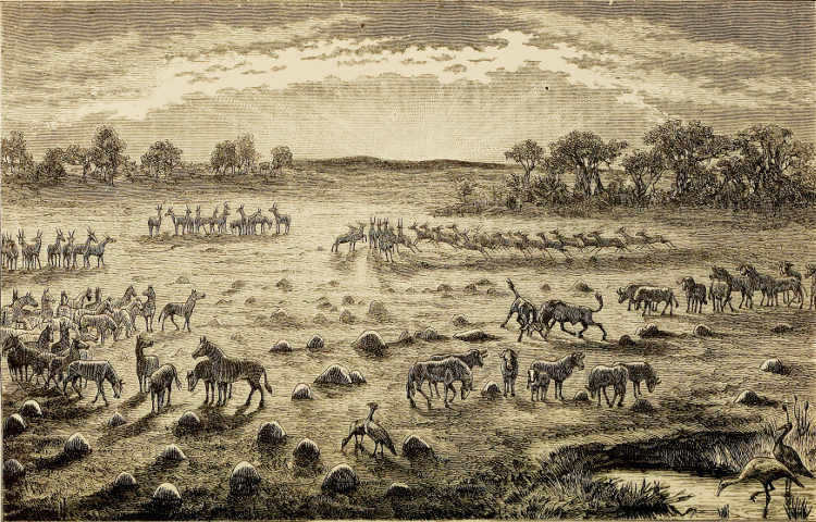 | Batlapin life—Weaver-birds and their nests—A Batlapin farmstead—Ant-hills—Travelling Batlapins—An alarming accident—Springbockfontein—Gassibone and his residence—An untempting dish—On the bank of the Vaal—Water lizards—Christiana—Bloemhof—Stormy night—Pastures by the Vaal—Cranes—Dutch hunters—A sportsman’s Eldorado—Surprised by black gnus—Guinea-fowl—Klerksdorp—Potchefstroom—The Mooi River valley—Geological notes—Wonderfontein and its grottoes—Otters, birds, and snakes | 118 |