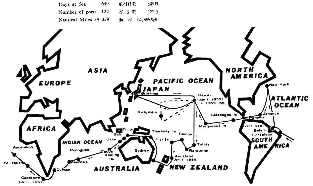 On April 26, 1960, we set out again, ready in all ways for our long passage across the Pacific to Japan. The weather was fair, the trades generally moderate, and our hearts were eager to reach Hiroshima, which we think of as home. Our route lay just north of one we had taken in 1958, to the forbidden zone near Bikini, but this time we were unmolested, since the bomb tests had long since been concluded.