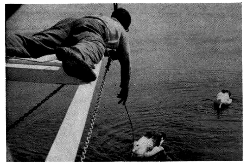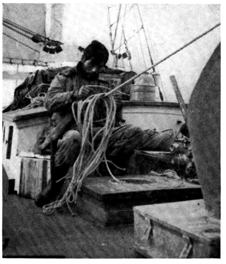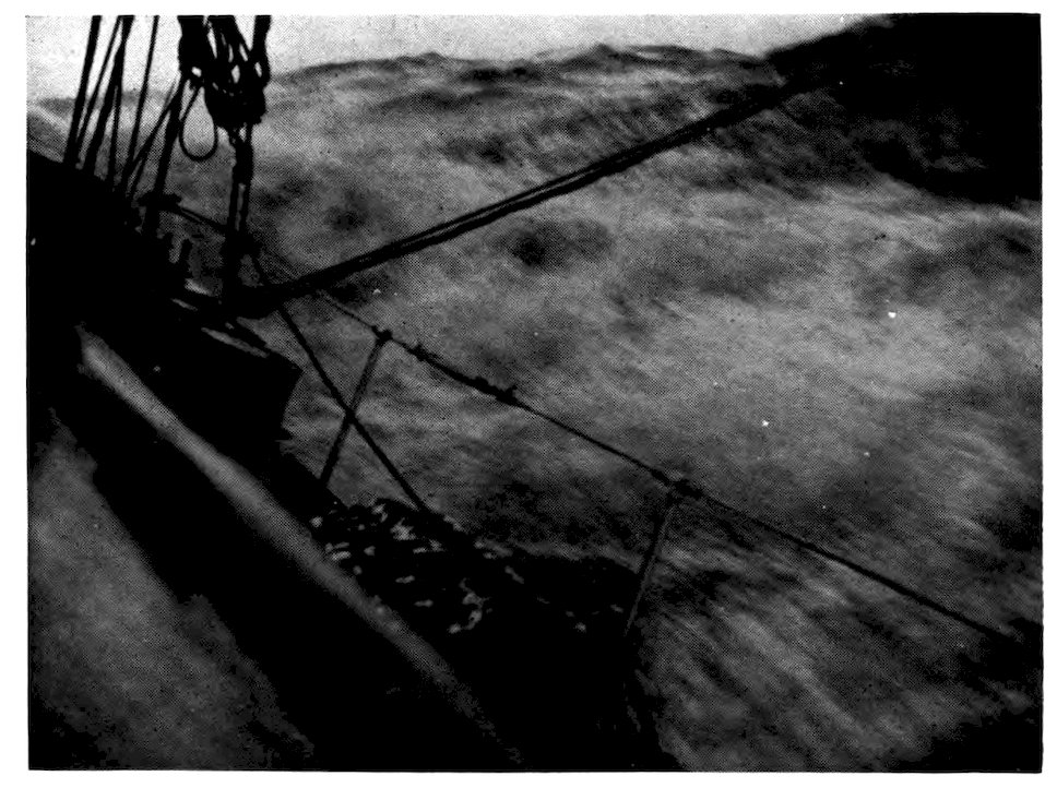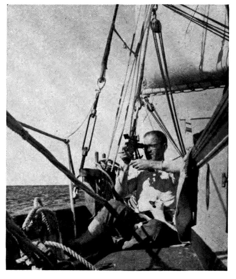 Two days later we lost another rotator from our taffrail log—about half a dozen had been taken in all—and spent a couple of days without one while I fashioned a spare from bits and pieces of several sets. The new rotator, when I put it into the water, worked fine—but backwards—so that our mileage on the dial registered in reverse. Far from being discouraged, we all thought this provided an interesting challenge, and Ted worked out tables which made it possible for us to record each day’s distance even with a rotator subtracting the miles.