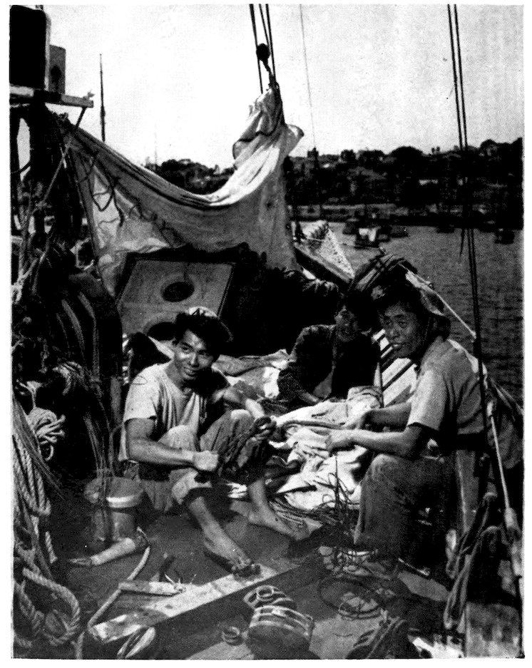 At Awaji-shima, we paused for a day or so in the tiny fishing harbor of Sumoto, while I took a flying trip (courtesy 303Japan Air Lines) back to Tokyo, to participate in a very popular nationally televised show, called “I Know a Secret.” I was the Secret of the Week—for about thirty seconds. The expert panel guessed my identity without asking a question, so we spent the rest of the time chatting about our trip around the world, using big maps which had been prepared at the studio in advance. Then back to Sumoto and on into the Inland Sea.