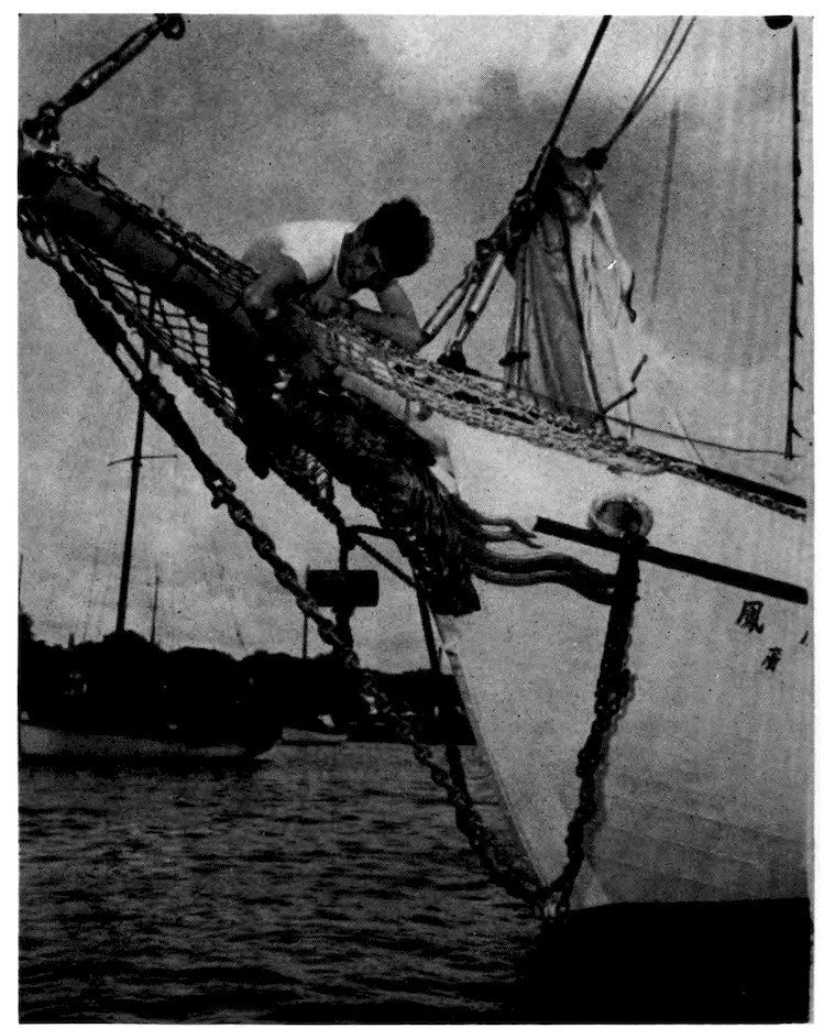 Our stay in Yokohama was extended one week beyond our planned schedule, for reasons which I will merely enumerate: (a) Typhoon No. 3. (b) Typhoon No. 4, which we rode out at an anchorage near the yacht club (we drew too much water to go into the club anchorage). For thirty-six hours we 302couldn’t get off the boat. (c) A berth up the river, where we promptly grounded and lay on our side for six hours at low tide. (d) A new berth at Dock 9, under construction, complete with dynamite blasts at irregular and nerve-shattering intervals. (e) Broken bowsprit, after being rammed by harbor boat, while we were sitting at the dock minding our own business. Consequence—had to make a new bowsprit—quite a job.