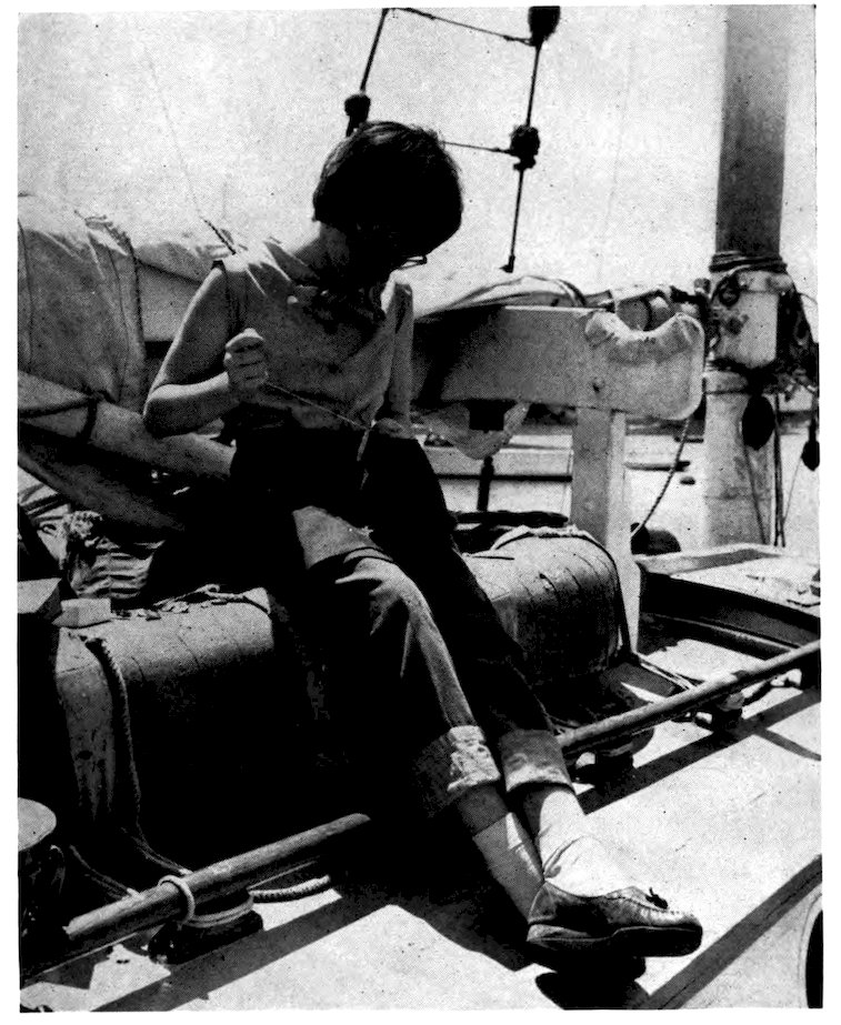 But we were not to finish the trip without a bit more work. The engine had given up entirely and now the sails all went on strike at once. First the foresail split, and while we had it down and were making repairs, a rip appeared in the main. With so much canvas spread out useless on the deck, we made little progress even before the wind dropped almost to nothing. Drifting idly in full view of our long-anticipated goal, we passed out the leather sailmaker’s palms, the thread and beeswax and sail needles. As we set to work to sew our way in, we were cheered by a brief glimpse of that majestic landmark, Mauna Kea, which appeared for a moment between the clouds. Twice a Coast Guard plane flew low over us, which Jessica interpreted as “Going back to get the leis ready!” The Skipper, however, suggested that it was more likely that they were going back to tattle about the rotten state of our sails.