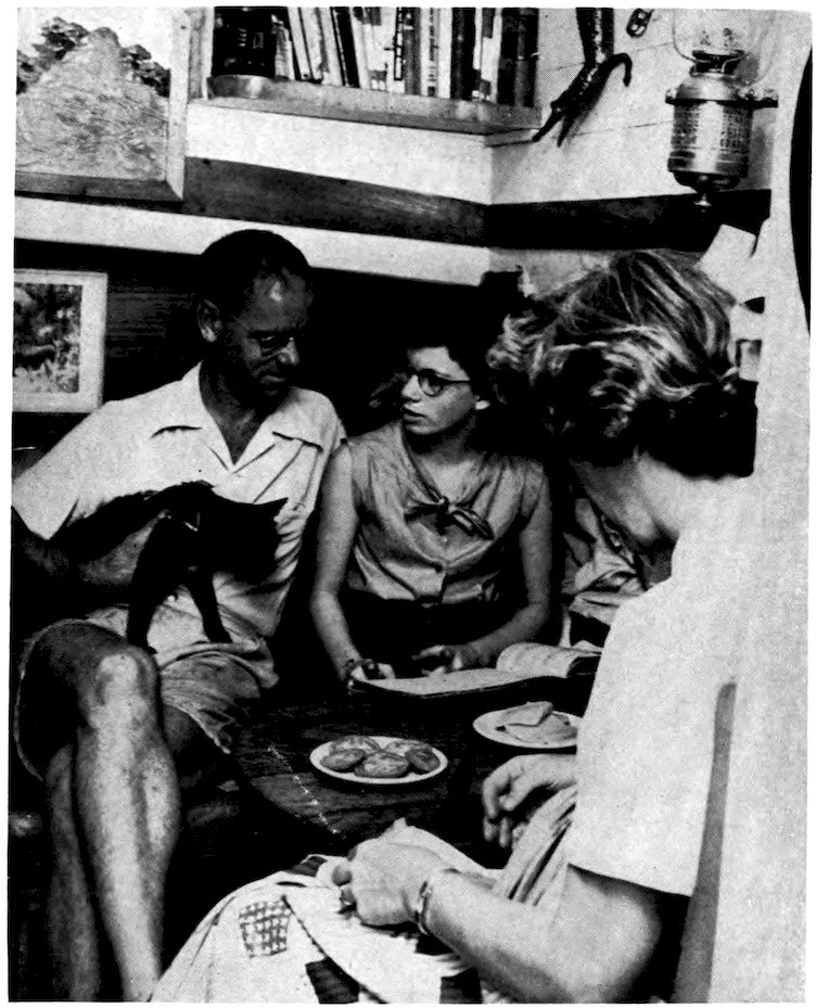 We left two of our passengers in Nuku Hiva. Goatie-Goat, who had been growing rapidly and eying the charts hungrily, remained behind, the proud possession of a Marquesan family. And we bequeathed Duchess, our disdainful Spare Cat, to Bob McKittrick. During all her months at sea she had never learned to adapt to us or to boat life but she took to Bob—and his plethora of unwanted rats—at once.