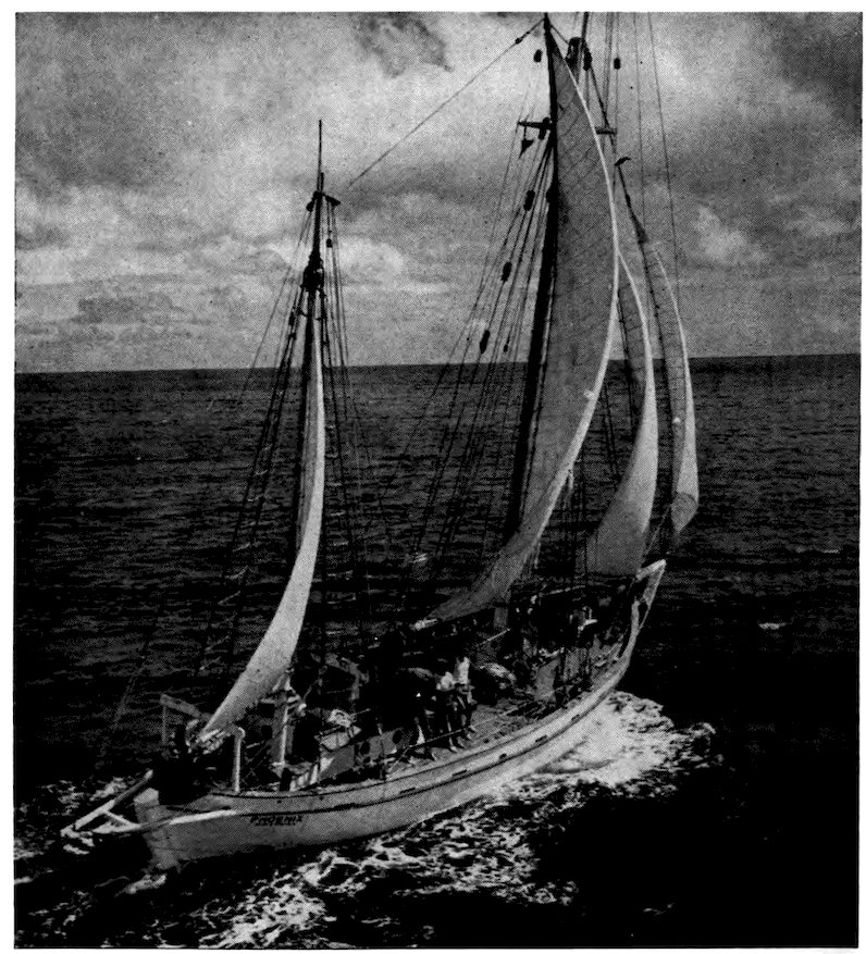 It was on the whole a quiet trip, although there were a couple of incidents. Also, we did a lot of experimenting with the sails, partly for the fun of it and partly because our sails were in such delicate condition that ingenious adaptations were necessary. We very soon tried the jib which Bill Huntington, of the Golden Rule, had given us, and it worked fine. A little later we set up for the first time a spinnaker, which we had bought secondhand in Honolulu. It also worked well, but we were spoiled by long years of lazy cruising and just didn’t have the racing man’s attitude. I’m afraid we never gave the spinnaker the attention it deserved, and when it began to demand too much attention we just took it down.