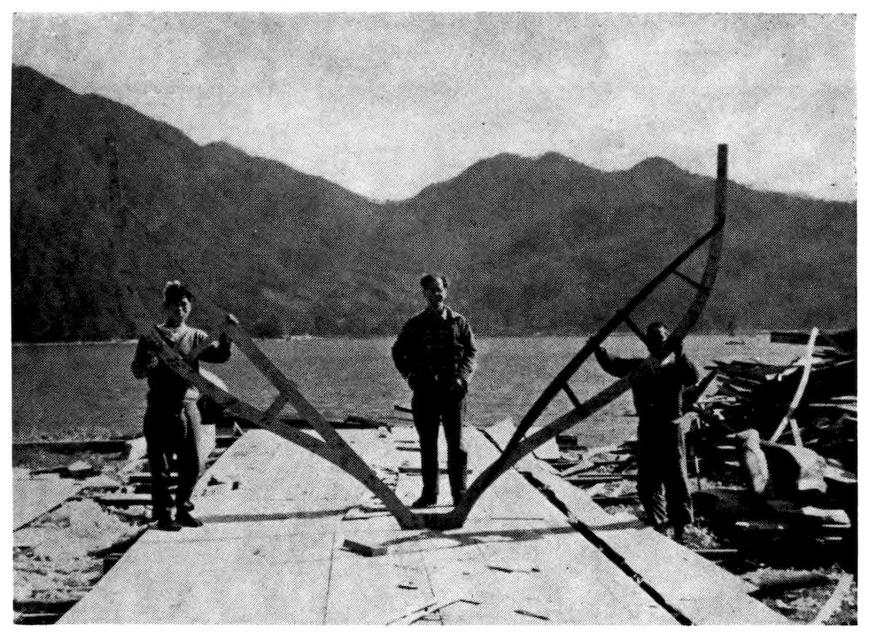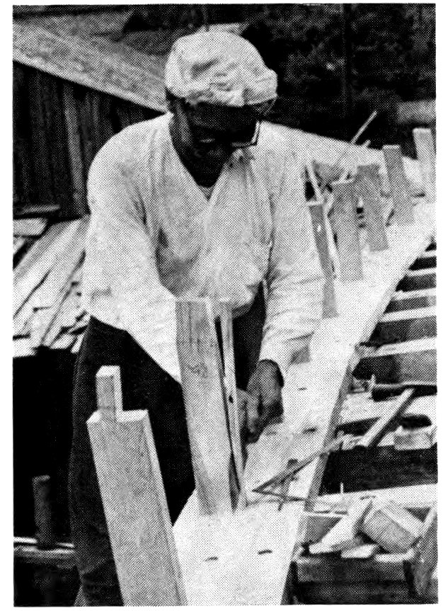 The workshop consisted of an open shed, with living quarters behind, and a nearby pile of scrap lumber. The shop had a bare and austere appearance to American, gadget-accustomed eyes. There were no high-speed tools in evidence, no laborsaving devices, no power saws or sanding machines, not even a brace and bit. There were only the traditional hand tools of Japanese boatbuilding—adzes, chisels, hammers, augers, saws. I noted that the saws functioned by pulling instead of pushing. As I later discovered, so did the workmen.