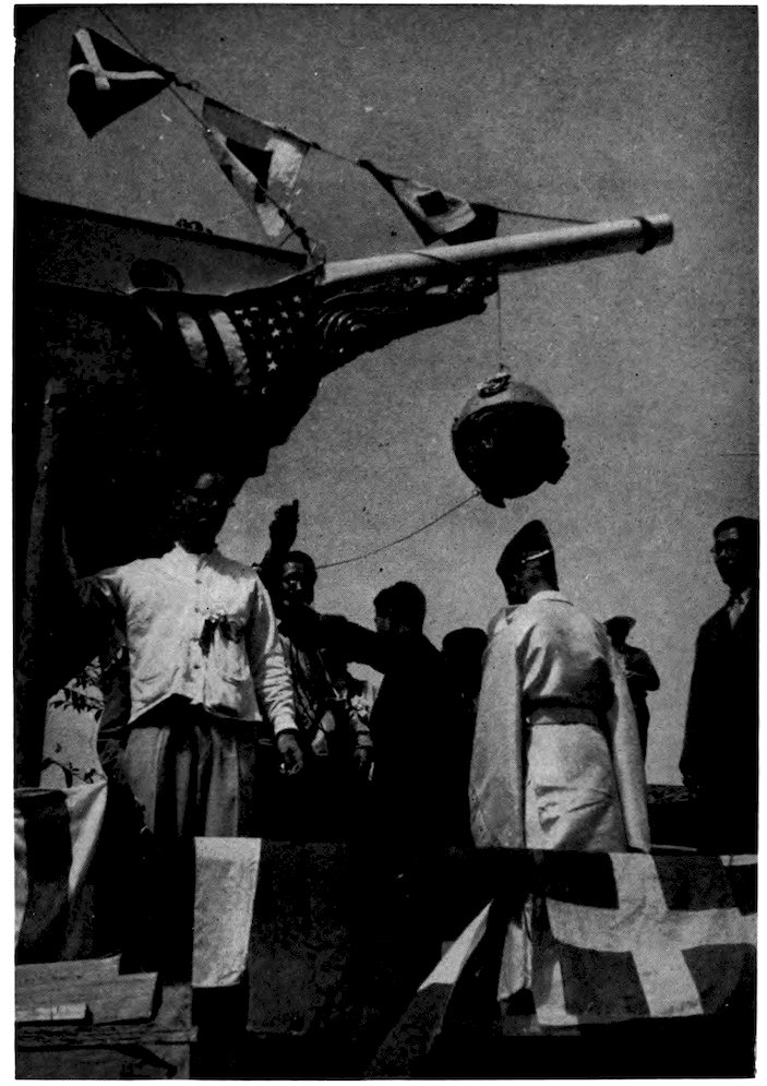 When the priest had finished, I made a short speech, and then mochi—pink and white rice cakes of ceremonial significance—were tossed to the crowd. The moment had come: it was high noon. I caught Yotsuda-san’s eye, and nodded. He smiled, bowed, and signaled to a workman. I suddenly thought, Well, Yotsuda, if this launching is a bust, I’ll be 2busted, too—but you’ll probably have to revive the good old custom of harakiri.