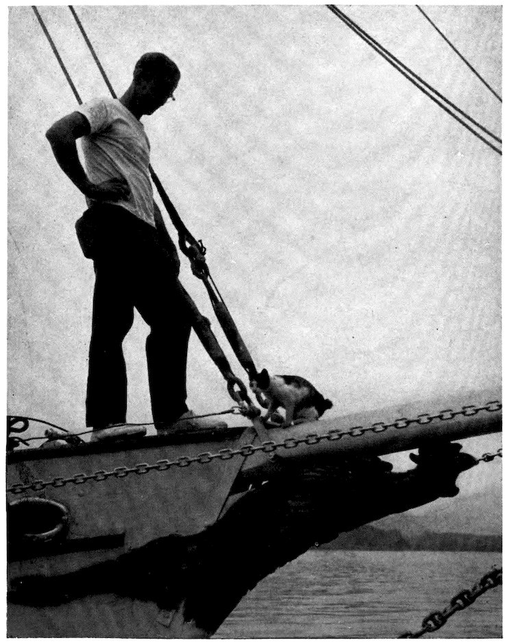 Of course, as was the case all around the world, we had a Cat and Spare Cat on board—Nos. 34 and 35, I believe, although I’m quite sure Jessica, who kept complete pedigrees, has accurate statistics in this department. Anyway, our present Ship’s Cat was named Daimyo—so called from the early feudal Japanese lord whose distinguishing characteristic was an overbearingly haughty attitude. Daimyo had one trick, and one only, but he worked it into the ground. He had learned to ring the ship’s bell when he wanted something—and he usually wanted something. In order to get a little peace, it was necessary to muffle the bell at night. A very early-morning log entry on several days indicates that I forgot—and paid the penalty by being awakened by Daimyo’s ringing for his breakfast.