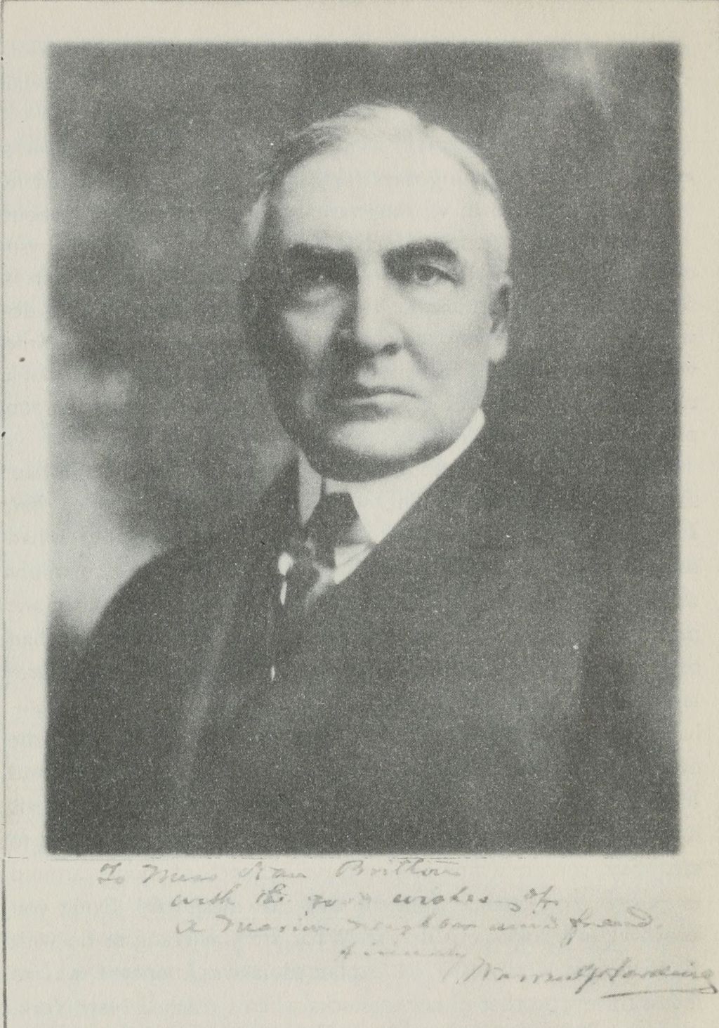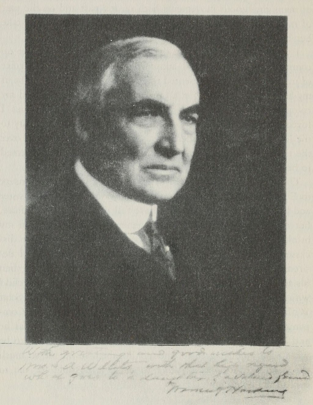 Nineteen-ten was an epochal year in my life. Ohio was electing a Governor, and the Republican candidate of that famous gubernatorial election was no other than the brother of my adored English teacher! I have often tried to remember how this knowledge was first conveyed to me; whether I had actually known that there was a Warren Gamaliel Harding from hearing conversations about him at home, whether I had been first introduced to his existence through talks with Miss Harding on one of the many “walks home” we used to have; whether I had heard of him through one whom I will call Mrs. Sinclair, whose husband, a judge and a prominent Democrat in Ohio, played cards with Mr. Harding very often; or whether I beheld his picture, ubiquitously displayed in almost every store window on Main and Center Streets, as I walked to and from high school. My early recollections are not so much concerned with actually seeing him as with the unforgettable sensations I experienced after I had once seen him and knew that he was for me my “ideal American.”