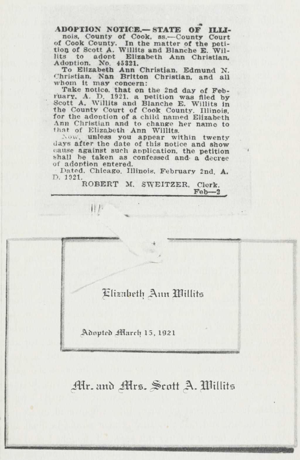 I had not had up until then, and did not have after their arrival, any discussion with Elizabeth and Scott of my attempts to date to establish Elizabeth Ann’s claim upon the Hardings, and they made ready to start back West, with my baby, after a few days’ visit. Again I was left alone. Again I had been forced to give her up.