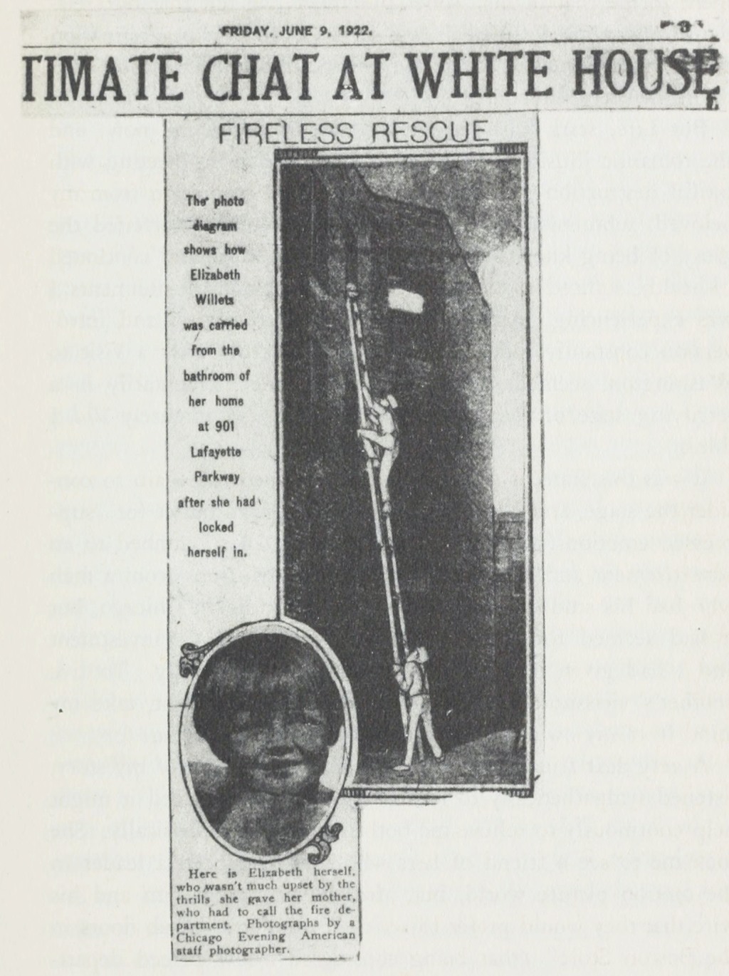 Very often the Harding car would whiz by our house, which was then on East Center Street, on Sunday afternoon, and I knew the occupants were headed for Bucyrus, a town some miles north-east of Marion which distance constituted a “nice drive” from Marion. Once, I remember, there were in the car Mr. and Mrs. Harding, Mr. and Mrs. Arnold, and their daughter Angela, as well as Frank the chauffeur, and of course the bulldog. I was sitting on our front porch. Mrs. Harding waved and blew me kisses and Mr. Harding doffed his hat and bowed. How I envied Angela! I would retire on such nights a most unhappy little girl. But I knew they would be coming back later on in the evening and so I would stay awake. My bed was alongside the window and the window screen opened on hinges like a door. I would swing wide open the screen and hang out of the window. I could see about fifty or sixty feet of street from that window and that part of the street was lighted by the corner street light. But even though it had not been lighted I would have recognized the smooth buzzing of those wheels as the great car sped swiftly past the house on its return from Bucyrus. Many a time I have waited until I knew he was safely back in our town.
