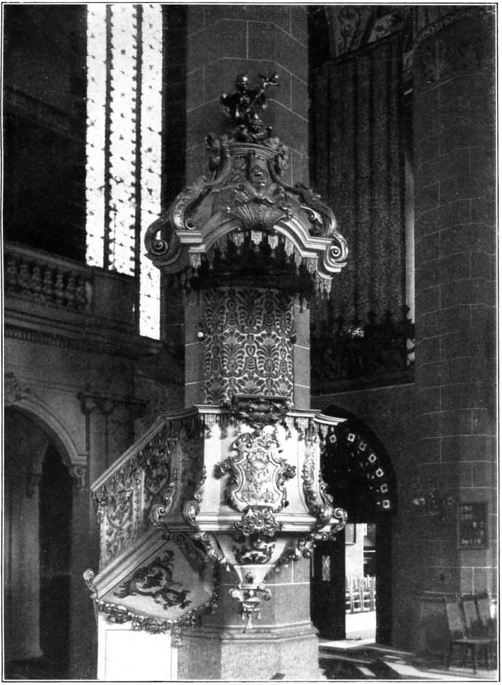 Von dem ursprünglichen Aussehen des Kircheninnern hat man durch zwei kurz vor Dauthes Umbau gemalte Aquarelle Kenntnis, und wenn man auch bedauern mag, daß manche hübsche Einzelheiten völlig verschwunden sind, wird man doch angesichts einer so mutigen und künstlerisch bedeutenden Tat, wie sie diese Umwandlung darstellt, sehr zufrieden sein, daß ein so eigenartiger Baugedanke Verwirklichung gefunden hat. Das hervorragendste Einzelkunstwerk aus der älteren Kirche ist die wahrscheinlich 1521 entstandene Kanzel, an deren Brüstungswänden unter reichen gotischen Baldachinen die Gestalten des Schmerzensmannes und der vier Kirchenväter in hohem Relief erscheinen. Sie ist ein Zeugnis für die mit dem zu Beginn des sechzehnten Jahrhunderts rasch aufsteigenden Reichtum der Stadt verbundene letzte üppige Blüte der Spätgotik in unserer Gegend.
