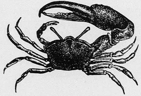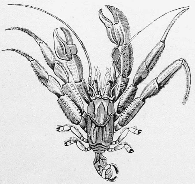 “That,” replied the Crab, proudly, “is the former home of a Sea-Snail, now alas! no more. You see my name of the Hermit-Crab comes from my liking to conceal my tail, which is long and soft, with two or three hooks on it, in the empty shell of some sea animal, snail, or the like. Unlike the ordinary crabs, our branch of the family all possess these tails. Our only hope of prolonging our existence is to protect this weak tail, so as soon as we are born we crawl into some empty shell, and holding on with the hooks, are thus fairly well protected from attacks in the rear. We can carry the shell about with us, and in time, as we grow bigger, it becomes necessary to find a larger one. The shell in which I now live once belonged to a big snail. It was just the right size for my needs, and, there being no other way out of the difficulty, I was compelled to eat him up in order to get possession of his home. It was a wrong act, the impulse of a moment, and I assure you that I have always deeply regretted the cruel deed,” and the Hermit paused to sigh deeply.
