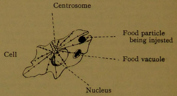 Usually, however, a cell is small—just as much protoplasm as its still more minute nucleus can keep going; though here, again, one must be guarded, for there may be several nuclei instead of only one. The protoplasm on the external surface and around the nucleus is specialized into a more or less definite membrane. To this outer envelope are attached fine fibrils, which join up to a small body within the cell, called the centrosome, and by the lengthening and shortening of these its shape can be altered. The contents are fluids; so if the containing membrane is loosened in any direction, they tend to bulge out and form an excrescence, and in this way the cell is enabled to throw out limbs and surround particles of food, and, by relaxing the fibrils in one direction and contracting them in others, to crawl whither its chemical, thermal, or physical affinities direct. (See Diagram 1.)