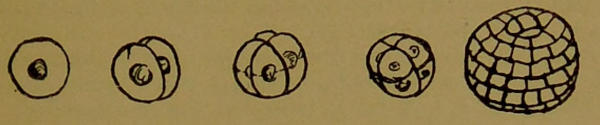The single eggcell which gave rise to our schematic embryo in Diagram 3, Fig. 1, was formed by the fusion of two cells shed by two distinct animals. How this one cell grows and multiplies by division is roughly shown in the diagram and those immediately following it; but though the cells do not separate, but hang together and form a body, it is obvious that the colony only amounts to a shoal of unicellular organisms, like that described above as growing weaker with each successive division unless blended with individuals of a different stock. This cannot be done in the body; what would become of our individuality even if such a thing were possible? The body can help to give rise to new bodies, but its own tissues must wear out, and when the colony of cells is exhausted it must die. Careful diet and regular habits, the minimum of wear and tear, may enable the body to run its full term; but they cannot lengthen the lease of life.