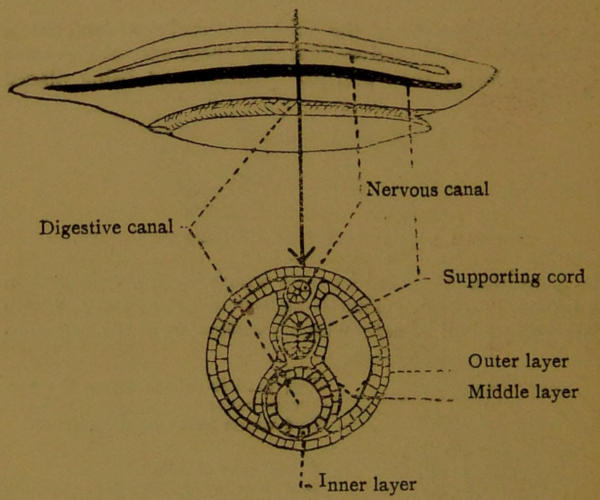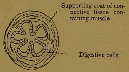 This, however, requires a number of other changes in the structure of the animal, which are roughly shown in Diagrams 5 and 6. It is not to our purpose here to discuss the development of animals or an animal; but the figures are worth glancing at, as they show not only how certain of the cells are set apart for digesting food, but also that a large body consists really only of a mass of protoplasm, composing kindred cells of common origin.