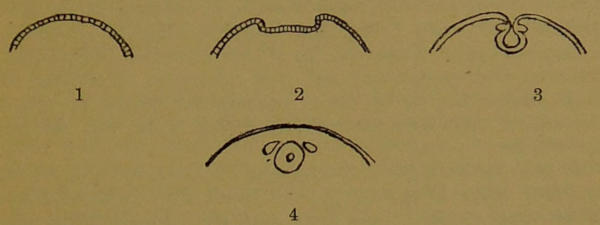 A step higher in the animal scale, or a further advance in the development of the schematic embryo (depicted in Diagrams 3 to 6), and we find that these special digestive cells are losing their sturdier qualities and being placed in a position protected by cells which have specialized in another direction. This is shown in Diagram 4, where the hollow ball of cells which resulted from the repeated division of one cell is represented in section. One side of the ball is pushed in, and now the beast consists of two layers of cells, an outer protecting and an inner digesting (Hydra and sea-anemone). Soon, however, it[18] is found more convenient to have a tube for digesting food, for then different substances can be digested and absorbed in different parts; and the refuse, of which the animal can make no use, need not be brought back to the mouth to be got rid of.