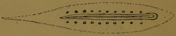 Perhaps the most interesting part of the whole body is that little band of the cortex running upwards from behind the temple to the crown of the head, in which (cf. Diagrams 64, 65 and 66) the motor areas of the limbs, and the perception of those sensations which we have grouped together and called ‘touch,’ are situated. The minute structure of this region is roughly shown in section in Diagram 67, as it has been made out with the microscope; but only a few of the nerve cells are shown, the connective tissue of feltwork in which they are suspended, and the bloodvessels by which they are nourished, being left out. All the structures represented are of course very, very small; the large black patches which represent cells would really be invisible, and the whole field of the diagram only a mere speck, to the naked eye.