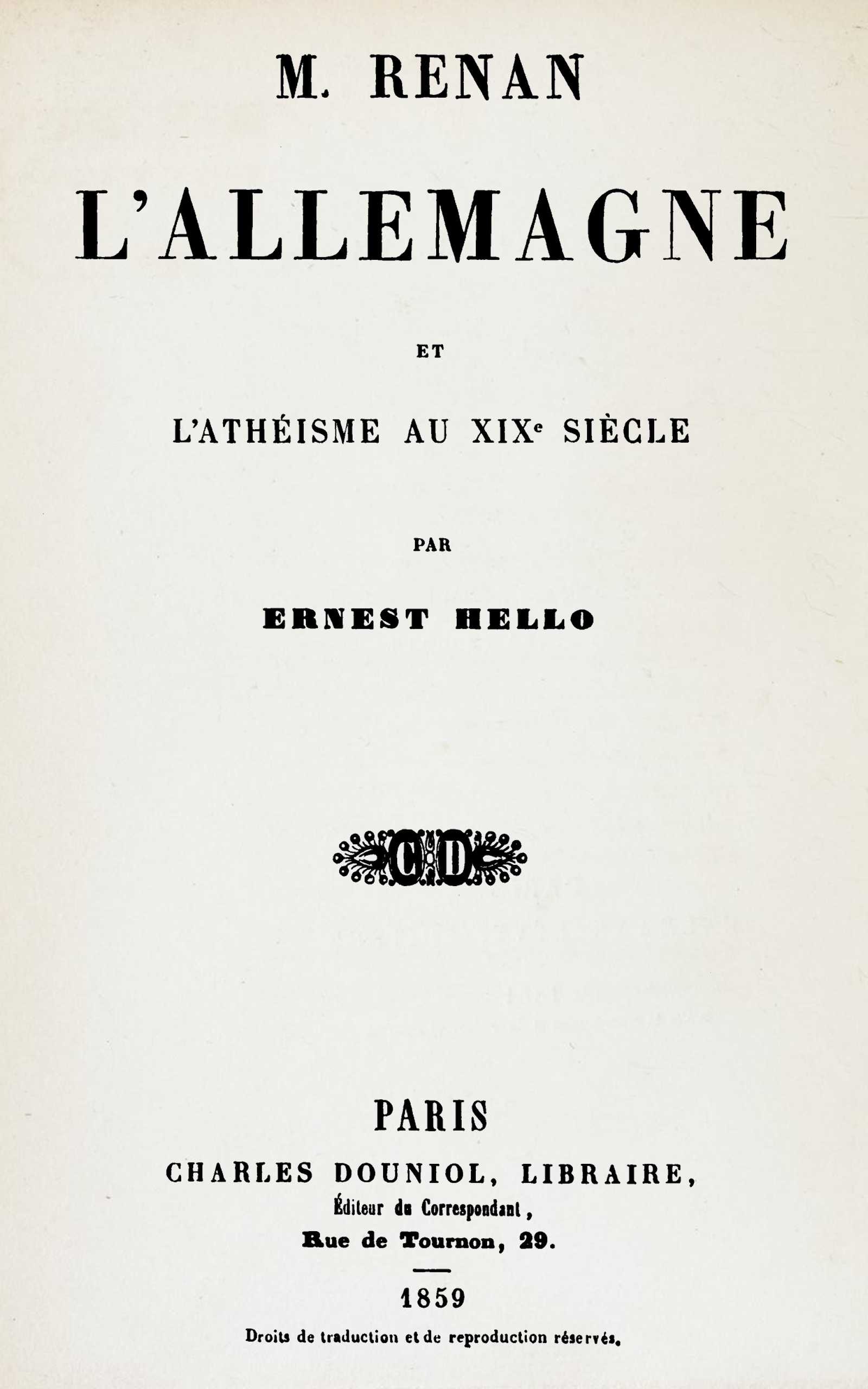 Nous allons étudier l’athéisme français dans le plus illustre de ses représentants actuels, M. Renan. Nous reconnaîtrons son magnifique talent ; mais nous l’admirerons sans nous laisser éblouir par lui. Nous nous tiendrons en garde contre le charme de cette parole humaine qui s’est tournée contre la parole éternelle, au lieu de la servir. Nous tendrons à ce noble égaré une main fraternelle ; nous lui offrirons dans nos rangs une place digne de lui. C’est donc pour lui, non contre lui que nous allons écrire ; mais nous prouverons à lui-même et à tous qu’il a lancé sur le monde ces quatre négations.