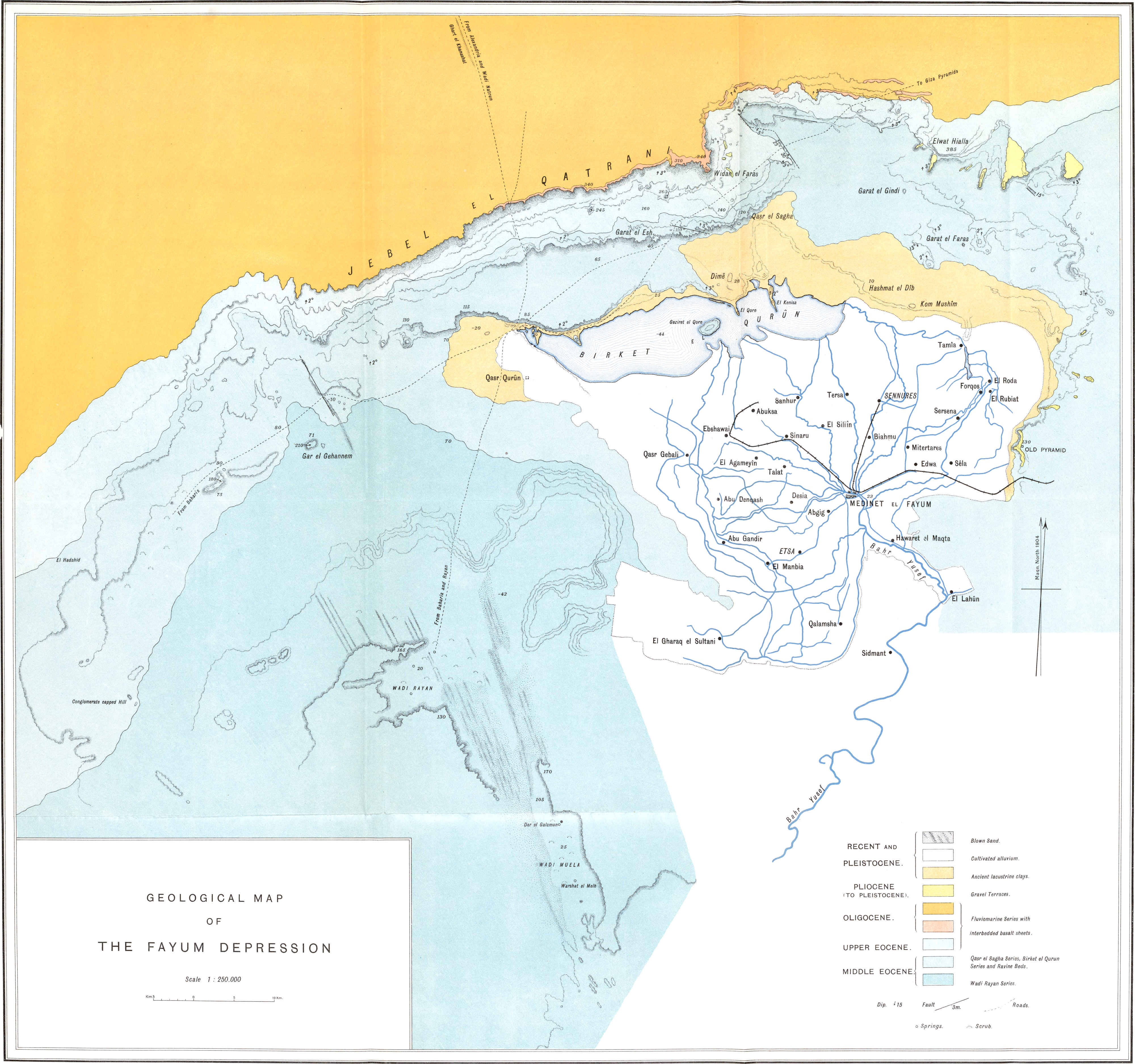 | Depression cut out in sedimentary rocks. Local lava flows. Dip. Oldest beds the Nummulites gizehensis limestones of Middle Eocene. Fluviomarine series of Upper Eocene and Oligocene age. Absence of Miocene strata. Pliocene, Pleistocene and Recent. Table showing succession and classification of strata | 33 |