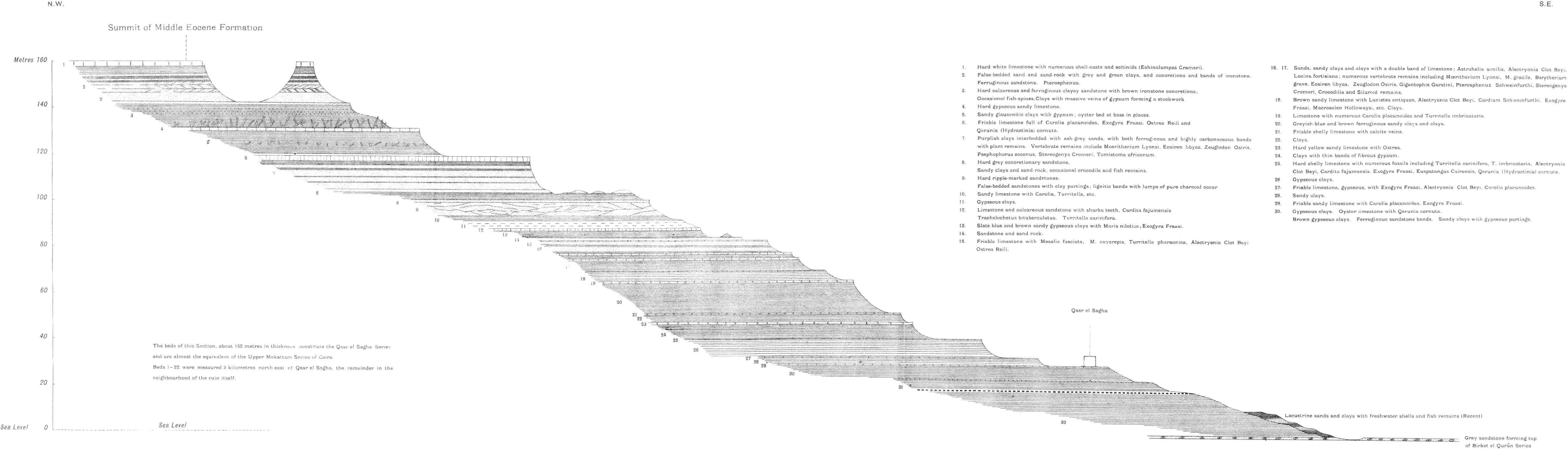 | C.—Birket el Qurun Series.—Homotaxial with quarried limestones of Cairo. Foraminiferal beds. Extension of series. Section at Ezba Qalamsha. Section north of Lahûn pyramid. East of Sersena and north-east of Rubiyat. Section 17 kilometres 28° N. of E. of Tamia. Series characterized by large globular concretions. Development and fauna in Geziret el Qorn. Zeuglodon remains. Profile at Geziret el Qorn. Rich molluscan fauna. Section on mainland opposite Geziret el Qorn. Section at west end of Birket el Qurûn. Formation of earth-pillars. Extension west of the lake. Development of the series in the Zeuglodon Valley. Abundance of skeletons of whales. Molluscan fauna. Pseudomorphs in celestine. Hill mass south of the Zeuglodon Valley. Junction of Birket el Qurûn series with overlying stage | 41 |