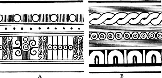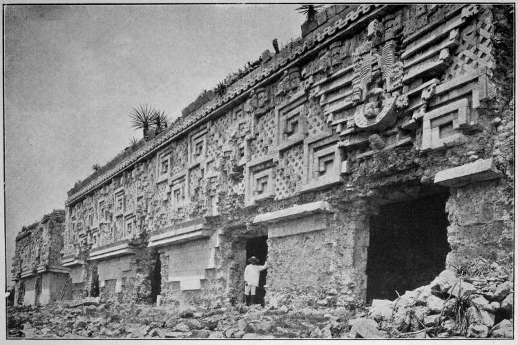 Uxmal, which, according to the Tutul Xiu account, was founded from Chichen Itza, shows, as regards the majority of its buildings, a very close correspondence with the Monjas group of the latter site. Most of the buildings exhibit the true Yucatec character, including the mosaic masks with projecting “trunks,” and pilastered ornament is also found. A few however do not[350] show these characteristics to the same degree, and present abnormal varieties of cornice, while others display signs of alteration and modification which imply at least that the site was inhabited for a considerable period. The most striking buildings, perhaps the finest in the true Yucatec style which exist, are the so-called “House of the Governor” (Pl. XXX; p. 358), the “Temple of the Magician,” peculiar in its oblong pyramid with rounded corners (Fig. 73, h; p. 321),[9] and the “House of the Doves,” distinguished by a vandyked roof-comb ornamented with open-work tracery. Lack of space forbids allusion to the many other Yucatec sites, such as Labna, Sayil, Kabah, and so forth, but it may be said that they embody similar forms of decoration such as the grotesque mosaic mask, and geometrical and pilastered ornament (Pl. XXV, 1; p. 332), though the structures can hardly be said to compare with those of Chichen Itza and Uxmal.