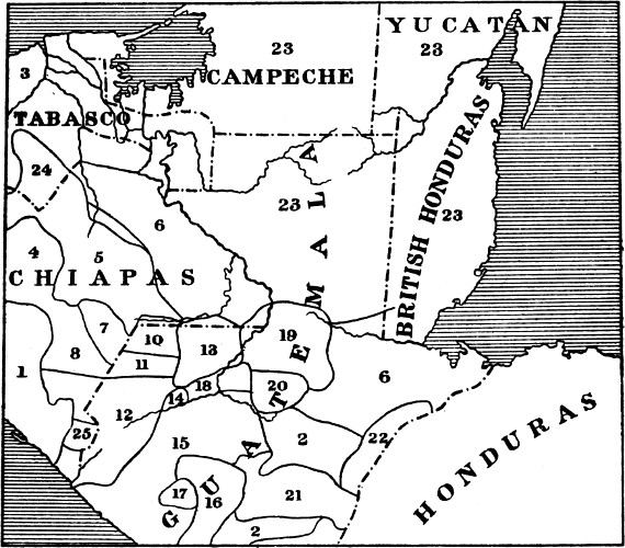 In the west of the Maya area, the remains, though plentiful, are inferior in quality, and have not attracted the attention of explorers to the extent which their importance, as indicating the spread of Maya culture, and its relation to that of Oaxaca, deserves. Sacchana and its neighbourhood is a site of great interest, since Seler has discovered there two stone slabs bearing initial dates in the Maya style, falling just each side of the date at Chichen Itza, which is otherwise the latest known. The style of these slabs is rude and decadent, but they are of the highest importance as indicating that the early method of reckoning time had spread as far west at least as the department of Huehuetenango. Otherwise the remains of this district are rude and coarsely built, of unsquared blocks usually without mortar; but mortar is found in some cases, notably in the tlaxtli-courts, which, as well as the pyramidal[352] mounds, bear a very close resemblance to those of Quiengola in Oaxaca (p. 175). A feature of this district is constituted by the number of cave-temples, which again recall the last-named province of Mexico. It is perhaps worthy of mention that a tendency appears in this neighbourhood to arrange temple-mounds in groups of three, in a straight line from north to south, with the stairways facing west. The western position of pyramid stairways, which implies that the worshippers faced east, has already been observed in Oaxaca and Mexico. An account of certain ruins at Utatlan, Iximché and Rabinal is given in the works of Maudslay, but they cannot compare with those of the central Maya area, and seem rather to resemble those of the district of Huehuetenango.