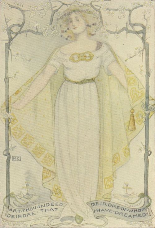 ‘This night, O Felim the Harper, shall a girl-babe be born to thee within these castle walls. Loveliest among the lovely shall thy star-eyed daughter be; no harp-strings shall yield such music as her voice, no fairy strains pour forth such wonder-stirring sound. Yet, O Felim, in days to come, because of this fair child shall great sorrow come upon our King Concobar and upon all his realm. In those days shall Erin’s chief glory perish, for if the House of the Red Branch fall, who shall stand?’