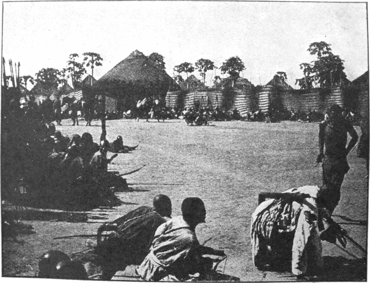 Un tam-tam qui se porte à ma rencontre vient à son tour retenir mon attention. Trois musiciens — trois enfants — composent l’orchestre. L’instrument, le même pour tous, est constitué par un certain nombre de planchettes disposées horizontalement les unes à côté des autres ; au-dessous d’elles est un rang de calebasses de grosseurs diverses. Ce piano rustique est maintenu éloigné du corps par une branche pliée en cerceau, dont la partie convexe s’appuie sur les cuisses ; une corde qui passe derrière la taille le retient et assure le contact ; il reste ainsi placé et fixé devant l’artiste, qui, frappant rapidement sur les planches avec des bâtonnets, en tire des sons mélancoliques et pressés. Son nom est djaboum ou dja, me dit-on. Ailleurs on le nomme balafon. Il est répandu, avec des variantes, dans une grande partie de l’Afrique.