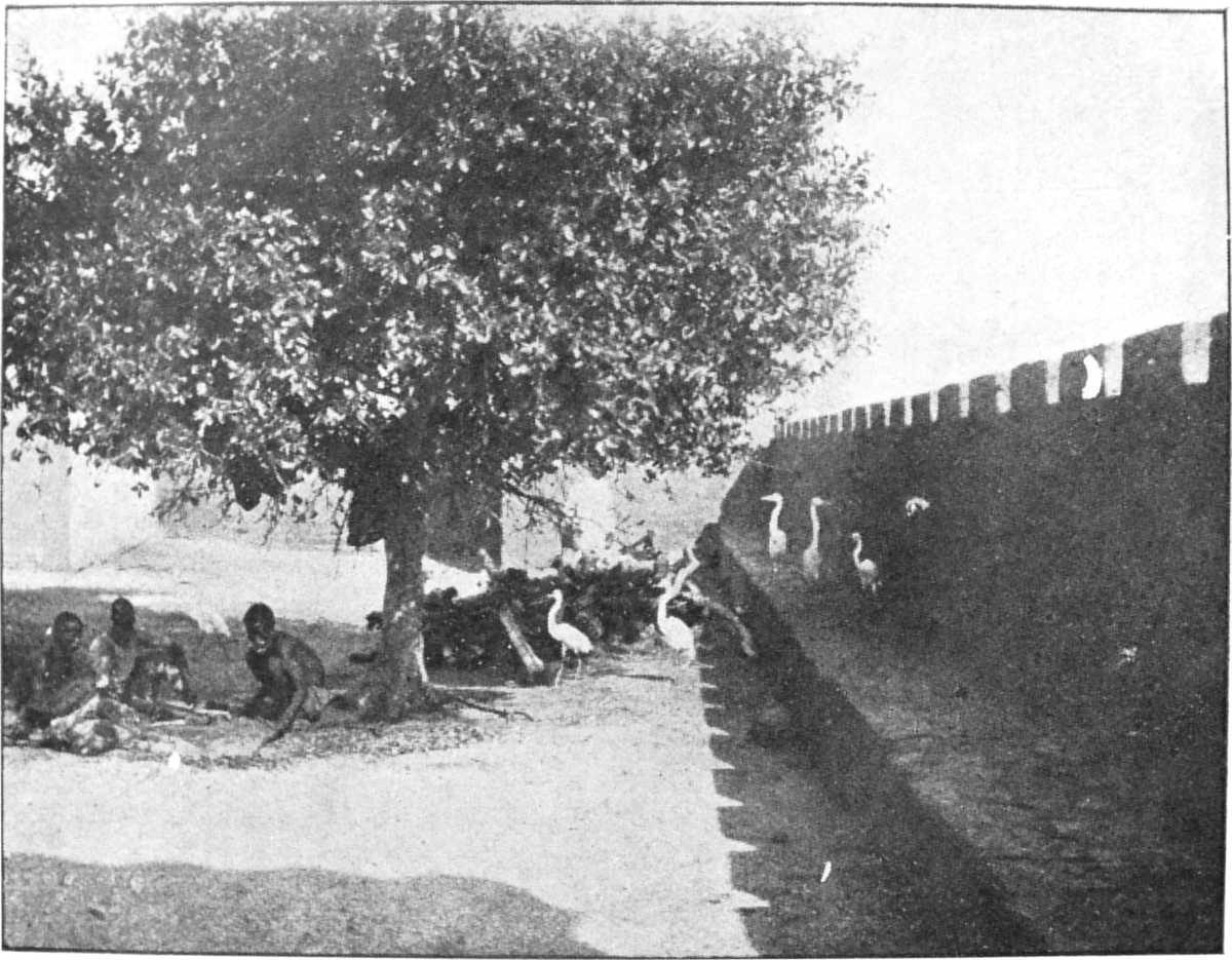 M. Fourn, le gouverneur du Dahomey, est là ; il vient recevoir M. Michel, délégué de la colonie, comme je l’ai dit, et Mme Michel. Je retrouve M. Fourn avec grand plaisir. J’ai gardé le plus agréable souvenir de son aimable accueil et de ses utiles conseils, au début de ma mission précédente, et je m’empresse d’accepter l’invitation qu’il veut bien me faire, avec la courtoisie qui lui est habituelle, d’être son hôte à déjeuner. Il a ménagé à M. et à Mme Michel la surprise d’une fête pleine de pittoresque ; parmi les détachements d’indigènes rassemblés pour leur arrivée, on remarque particulièrement des échassiers vêtus de costumes chatoyants et barbares qui, sans autre soutien que de longues perches de trois à quatre mètres fixées par des liens à leurs jambes, se promènent, penchés en avant, à pas immenses, à la hauteur des palmiers des avenues.