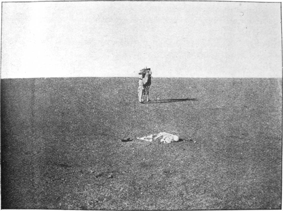 | 17. | Un des squelettes humains de la route de Koufra, et mon chameau, tenu en main par Ahmed. |