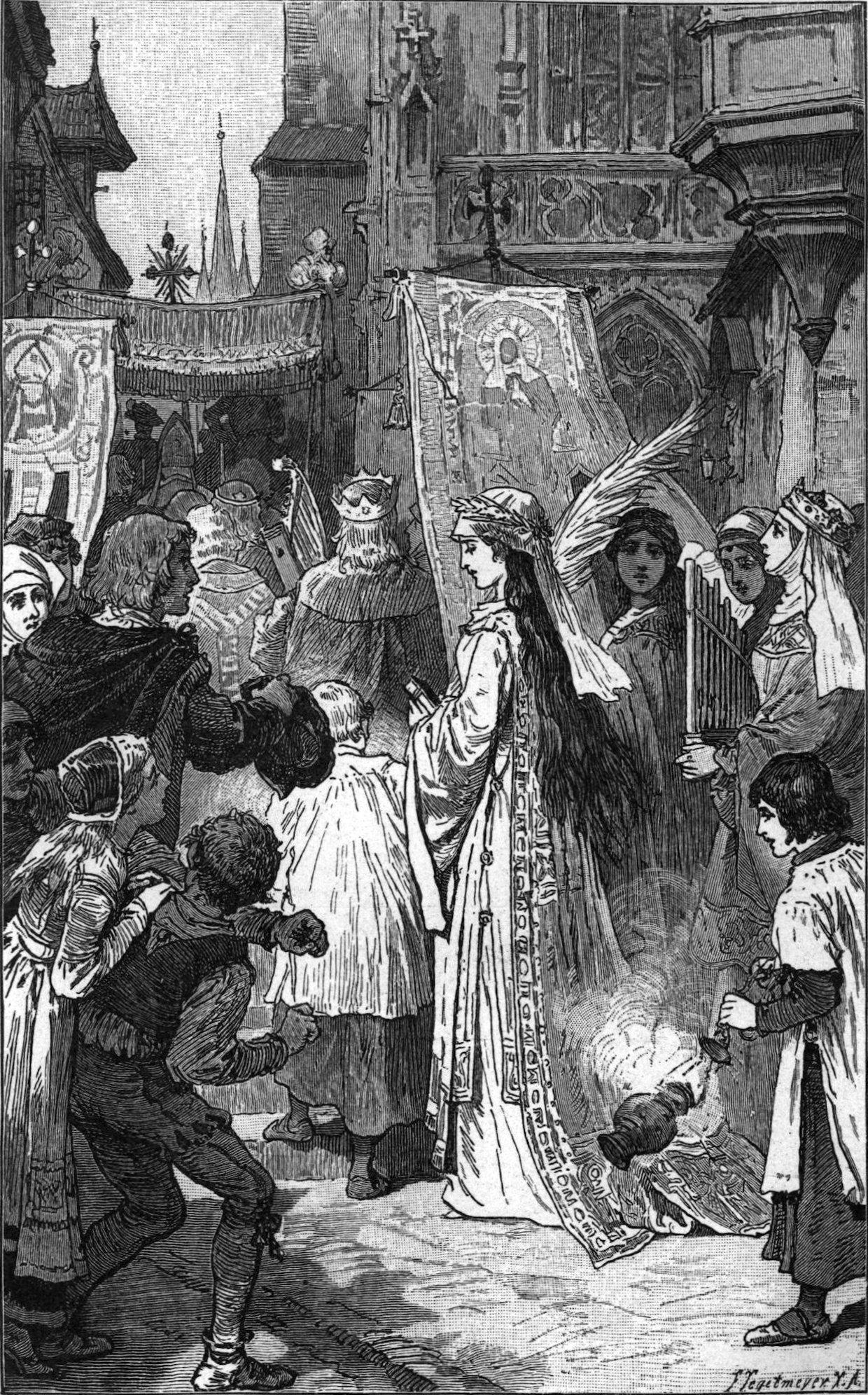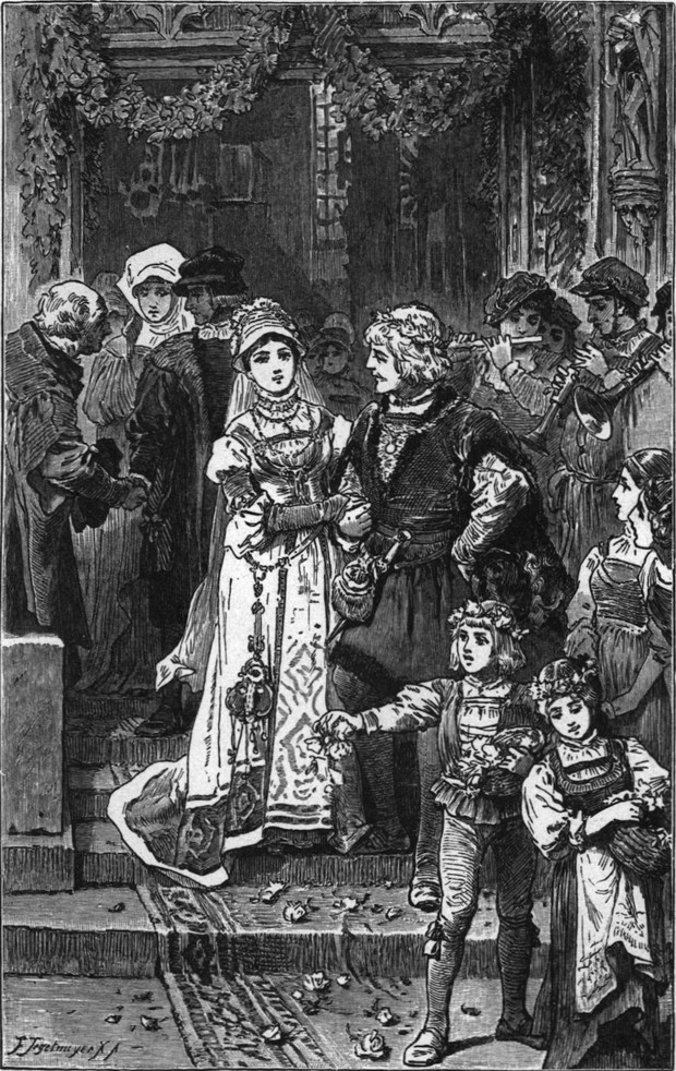Die Thür ging auf, und in fröhlichen Zuge traten die Kinder ein. Margarete hatte ein blaues Tuch an ihrem Leibchen befestigt, so daß es wie eine lange Schleppe hinter ihr dreinzog, über ihren Locken lag ein[S. 24] weißer Schleier, den ein grünes Kränzlein festhielt. So trippelte sie mit gesenkten Augen neben Ulrich hin, der einen langen Mantel um die Schultern geworfen hatte und mit stolzer Miene einherschritt. Voran ging Berthold als Herold, mit Fahne und Trompete, und die kleine Elsbeth folgte als Schleppträgerin. Es war ein liebliches Bild und Frau Ursulas Mutterherz hob sich höher beim Anblick der reizenden Kinder. „Welch ein Spiel habt Ihr heute ausgedacht?“ fragte sie liebreich.