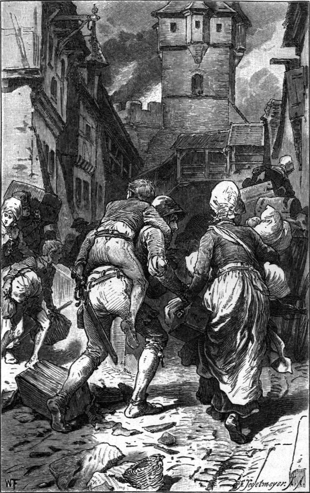 Schon acht Tage lang tobte der erbitterte Kampf, und auf beiden Seiten war eine Pause der Ermüdung eingetreten. Der Donner der Kartaunen war endlich verstummt, die Einwohner atmeten nach der furchtbaren Spannung freier auf. An der Thür eines kleinen Hauses stand in der Abendstunde ein junges Weib und schaute mit angstvollem Blick die Straße hinab, auf der jetzt bewaffnete Männer, einzeln und in Gruppen, vorübereilten. „Habt Ihr den Matthias Fiedler nicht gesehen, Nachbar?“ rief sie dem einen und dem andern Bekannten zu, doch erhielt sie keine Antwort, außer einem flüchtigen Kopfschütteln; es hatte eben keiner Zeit, an den Nächsten zu denken. Jetzt kam ein Mann daher, müden Schrittes schleppte er sich weiter, tödliche Erschöpfung war seiner ganzen Erscheinung aufgedrückt. Sie flog ihm entgegen und[S. 11] legte stützend den Arm um ihn. „Kommst du endlich, mein Matthias?“ sagte sie liebevoll, „o wie habe ich mich um dich geängstigt! ich meinte schon, ich sollte dich niemals wiedersehen!“