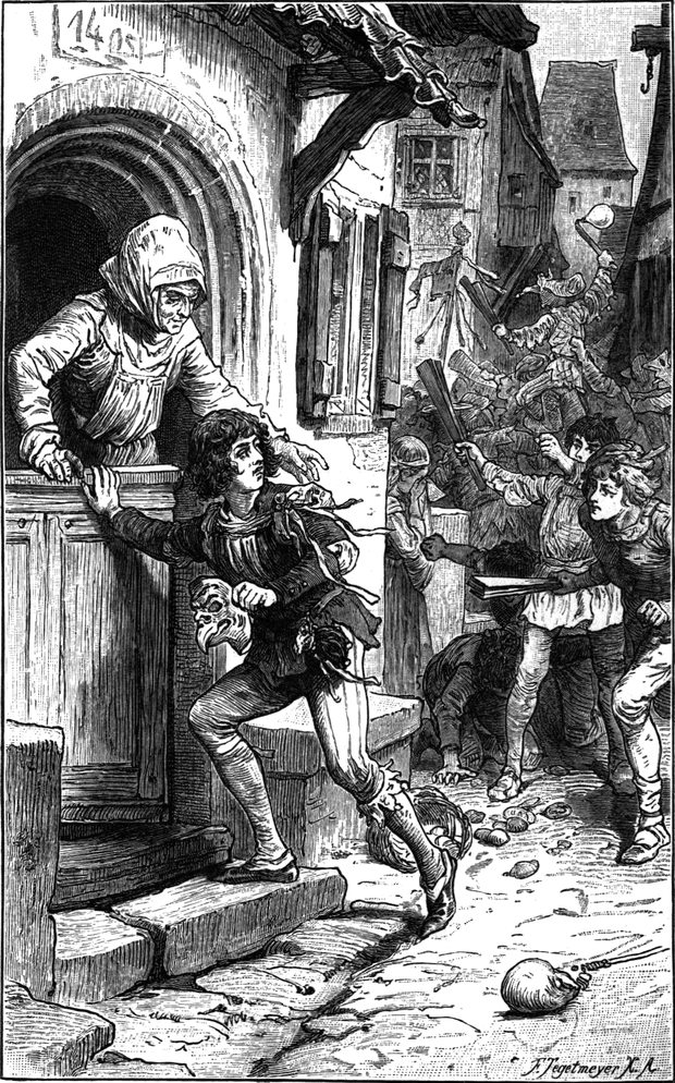 In das Patrizierhaus führte ein breiter Thorweg, der nicht nur für Menschen, sondern auch für Wagen und Pferde zum Eingang diente; die kleinen tiefliegenden Fenster zu beiden Seiten waren mit Eisenstäben vergittert und gaben dem Gebäude das Ansehen einer wohlverwahrten Festung. Wer durch das Thor eintrat, befand sich in einem gepflasterten, nach hinten geöffneten Hausflur, aus dem zu beiden Seiten Stufen zu den Schreibstuben und Warenräumen emporführten; geradeaus aber kam man in einen großen Hof, an dessen einem Ende leere Fässer und Kisten aufgespeichert lagen, während an dem andern ein[S. 19] uralter Nußbaum emporragte. Der hatte wohl schon seit zweihundert Jahren dort gestanden, und wie er sich aus einer schlanken Gerte allmählich zu einem mächtigen Stamm entwickelt hatte, so war auch das Haus ringsumher gewachsen und die Familien, die darin gewohnt, hatten zugenommen an Reichtum und Bedeutung. Er war ein treuer Freund aller Bewohner gewesen, der alte Nußbaum; den Kindern diente er als unschätzbarer Helfer bei ihren Spielen, beim Klettern und Verstecken; den Mädchen ließ er im Frühling seine raupenartigen Blüten neckend in den Schoß fallen, den Knaben warf er im Herbst seine Früchte an den Kopf, den Hausfrauen aber schenkte er seine wohlriechenden Blätter, die, mit Lavendel vermischt, die geschnitzten Schränke und mächtigen Truhen mit einem gar lieblichen Geruch erfüllten. Wenn kosende Frühlingslüftchen mit den Zweigen spielten, dann klopften diese wohl leise an die Fenster, wie gute Bekannte, die um Einlaß bitten; wenn aber in Herbst- und Winternächten der Sturm heulte, dann peitschte er die Äste gegen die Mauern, daß die Schläfer drinnen die Köpfe tiefer unter die Decken steckten, weil es klang, als zögen böse Geister über den Hof.