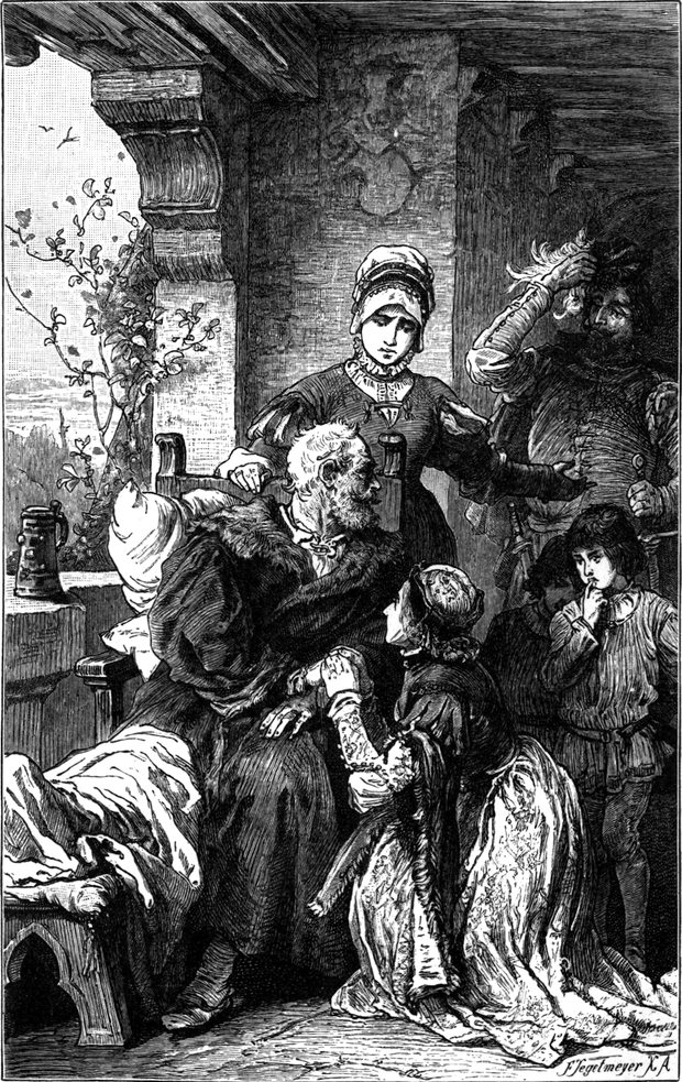 Über des Ritters wettergebräuntes Gesicht flog ein wehmütiger Schatten. „Habt Dank für Eure gütige Nachfrage, ehrsame Frau,“ erwiderte er; „mein Weib ist gesund, aber mit unsern Töchtern haben wir kein Glück. Zwei hat der Himmel wieder zu sich genommen, und Sankt Kilian mag wissen, ob ich die jüngste noch am Leben finde, wenn ich heimkehre.“