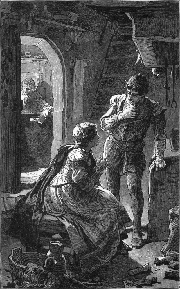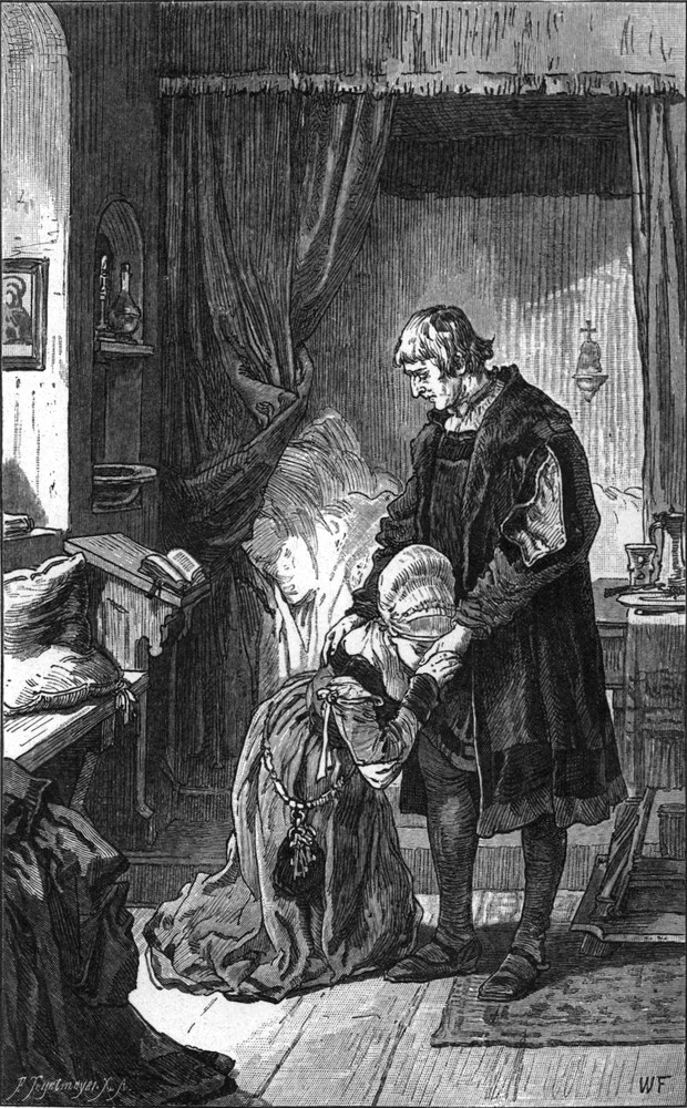 „Nein, nein!“ rief sie lebhaft und schloß ihm die Lippen mit einem Kuß, „sprich nicht so, Matthias! Tausendmal lieber mit dir in Lüttich zu Grunde gehen, als in Nürnberg ohne dich ein ruhiges Leben führen! Es ist auch nicht um mich, wenn ich klage, nur um die Kinder — um unsern Hans und die kleine Matthäa —, das Mutterherz blutet, wenn es denkt, daß ihnen ein Leides geschehen könnte! Aber nun schlafe, teurer Mann, und sammle neue Kraft, du wirst sie brauchen.“