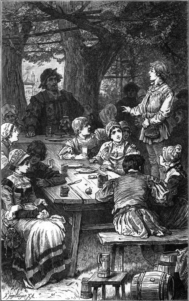 „Ich hoffe, edler Herr,“ sagte Ebner höflich, „Ihr werdet mein Haus nicht verlassen, ohne einen kleinen Imbiß einzunehmen; meine[S. 21] Hausfrau würde es mir nicht verzeihen, hätte ich Euch ohne Speise und Trank davonziehen lassen.“