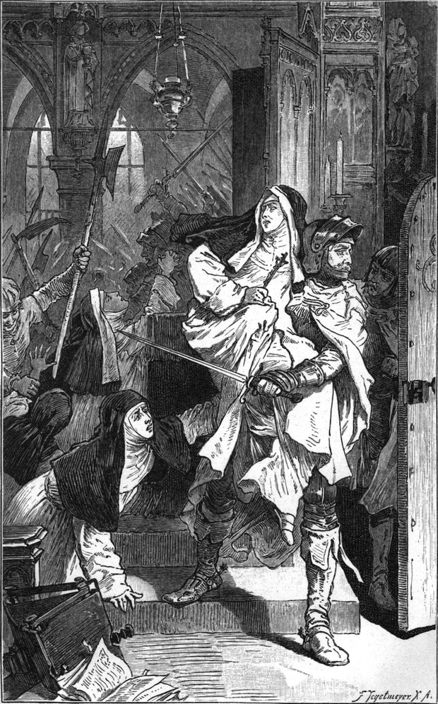 Sie führte ihn in das Haus, wo ihnen ein zehnjähriger Knabe entgegenkam; Mutter und Sohn beeiferten sich, dem Vater die Rüstung und die schweren Waffen abzunehmen, und bald streckte er sich behaglich auf dem bereitstehenden Lager aus. Erst, als er sich mit Speise und Trank gestärkt, that die Frau einige Fragen nach dem Stande der Dinge. „Für die nächsten vierundzwanzig Stunden ist nichts zu fürchten,“ versetzte Matthias, „unsre Kundschafter brachten uns Botschaft, daß Herzog Karl selbst der Ruhe bedarf. Freilich ist’s nur ein kurzer Aufschub; morgen, zu Allerheiligen, werden die Geschütze schweigen, danach aber müssen wir uns auf einen Sturm gefaßt machen. Mögen Gott und alle vierzehn heiligen Nothelfer uns beistehen, daß wir der Gewalt des furchtbaren Herzogs nicht erliegen — sonst würde es uns schlimm ergehen.“