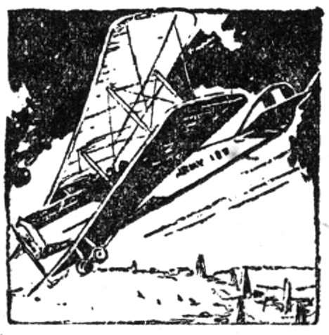 Jimmy Devlin handed the pilots of Pacific Field a laugh when he paid four hundred dollars for the old biplane wreck that had been lying in Hangar Number Three ever since the field opened. Jimmy himself indulged in a laugh, but it was a hopeful one. He had gone over the wreck pretty thoroughly and knew exactly what he was buying. The landing gear was pretty much of a mess. One of the lower wings would have to be almost completely replaced. The prop was splintered and the crankshaft of the engine was broken. So were several tie wires, one wing strut, and the tail skid.