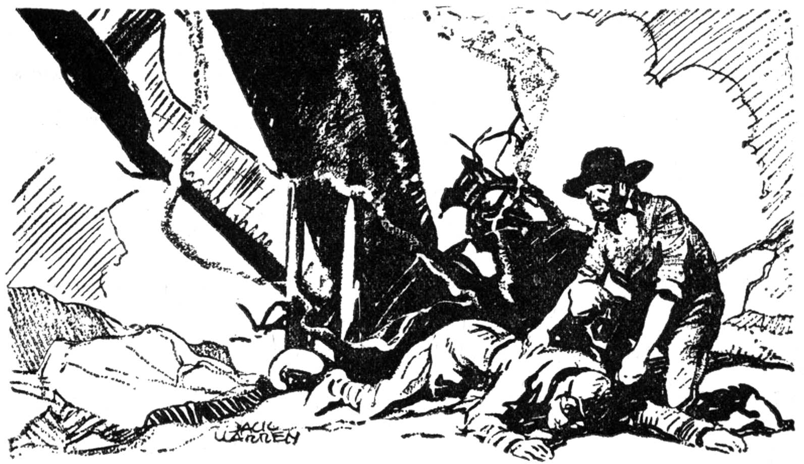 When Jimmy regained consciousness, he found himself several yards away from the wreck. Rough splints and a bandage were around his right forearm. One of his eyes was swollen shut and a bandage was wrapped around his head. His left leg throbbed with pain. He was lying on a blanket and another blanket was spread over him. A few yards away Weber was bending over a fire. The old man’s clothing was torn, but he moved about as though he was not seriously injured.