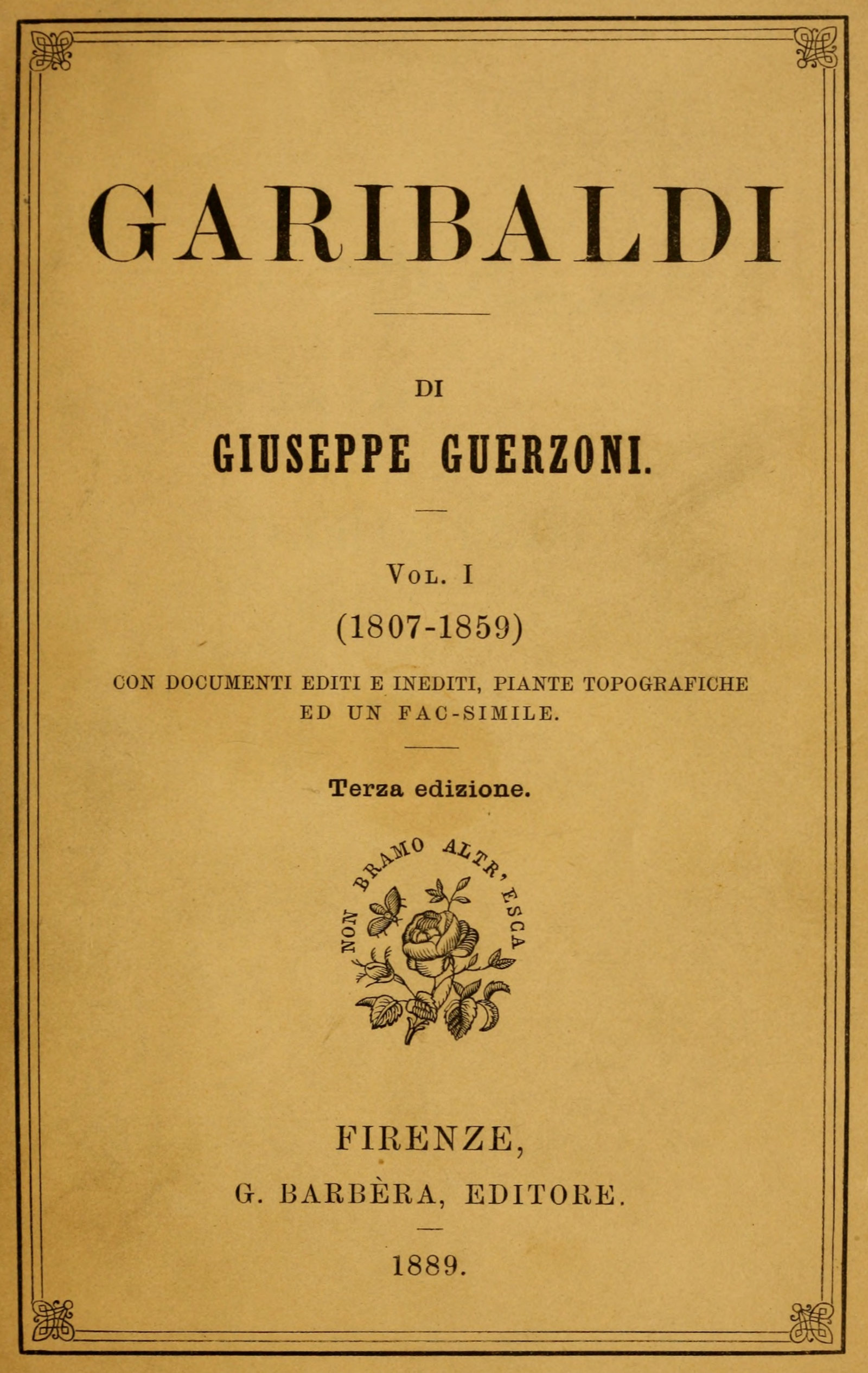 La Vita di Giuseppe Garibaldi, narrata dal P. Giuseppe da Forio, Napoli, St. Tip. Perrotti, 1862; compilazione laboriosissima in due volumi in-8º, e nel secondo, repertorio affastellato, ma fitto di articoli di giornali, di lettere di Garibaldi, o a Garibaldi, di squarci di libri, di documenti e materiali [xxi] d’ogni data, nel quale frugando con tatto e accortezza, si può accattare una messe di notizie.[4]