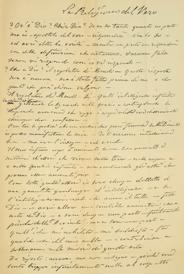 «..... Eppure quella razza reproba siederà domani, e protetta, accanto ai rappresentanti delle nazioni più cospicue, e chiederà con insistenza la continuazione, la conferma del suo potere temporale, che vuol dire, in lingua umana, la continuazione, la conferma di poter pesare sopra alcuni milioni di sventurati Italiani!... come una sciagura, una maledizione!... la continuazione di un potere che non si adopera ad altro che a rubare ai poveri nostri fratelli il loro oro per gozzovigliare schifosamente, a comprare mercenari stranieri per combattere Italiani!... la continuazione di un potere che non conta amici, se non che tra i nemici d’Italia.... e tra quelli che vogliono dividerla e manometterla e soggiogarla!... un potere che ha scagliato l’anatema sul popolo e sull’esercito rigeneratore.... sul Re prode e generoso che Dio ha dato agl’Italiani!...