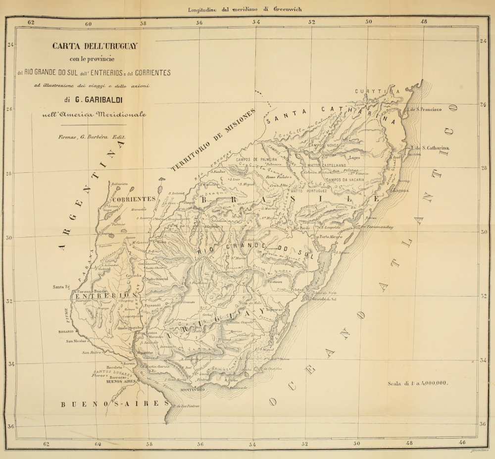 Una conoscenza scarsa ed una esposizione inadeguata della storia e delle costumanze, delle fazioni e delle rivoluzioni appunto di quei due Stati dell’America meridionale, il Rio-Grande e l’Uruguay, tra i quali Garibaldi si formò; epperò una rappresentazione troppo vaga e fantastica della parte che [xii] egli vi ebbe, degli influssi che vi subì, del patrimonio di idee e di abitudini che ne riportò;