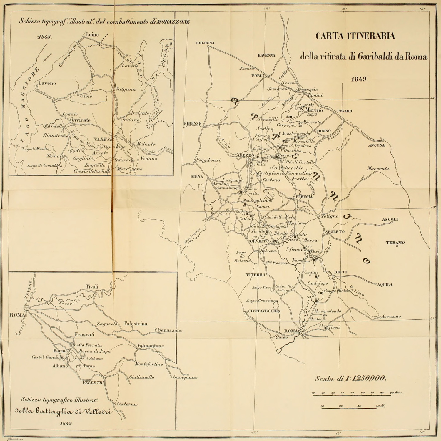 Garibaldi in Rom, Tagebuch aus Italien 1849, von Gustav Hoffsteter, già maggiore nell’esercito romano, Zurich, Schulbers, 1860. Diario indispensabile alla storia della celebre ritirata da Roma.