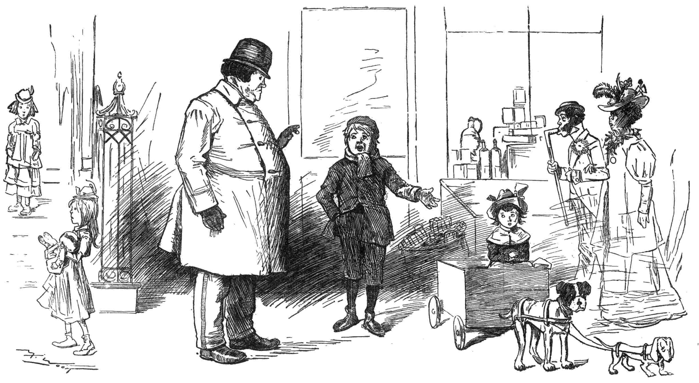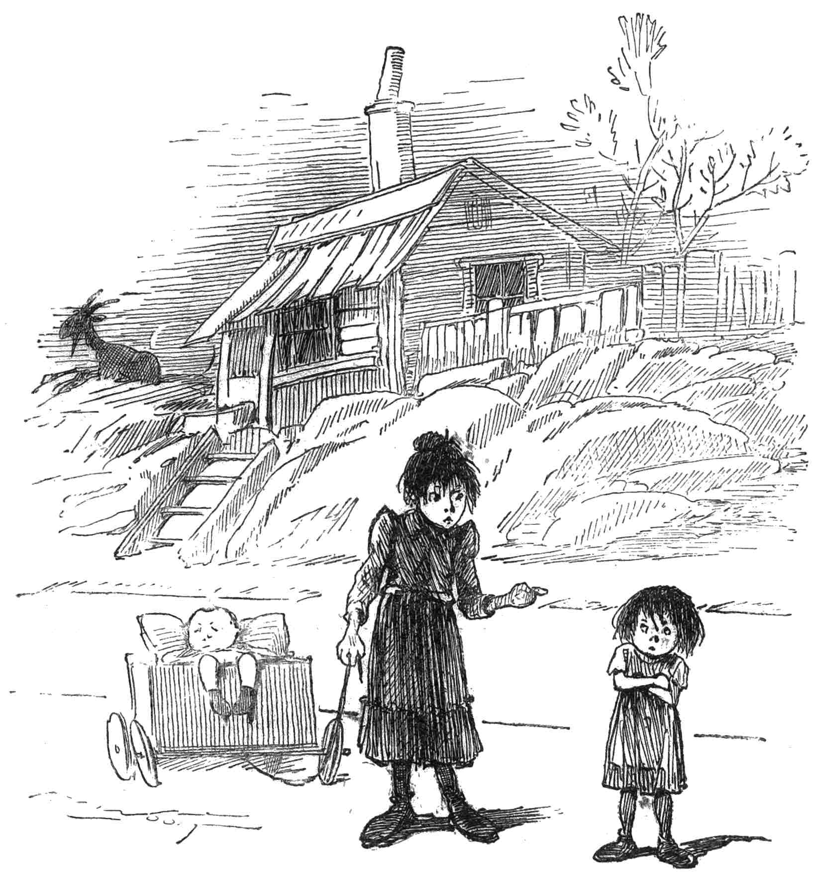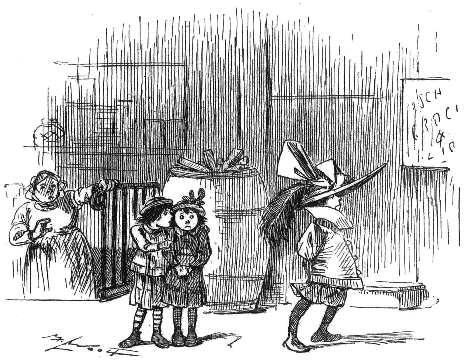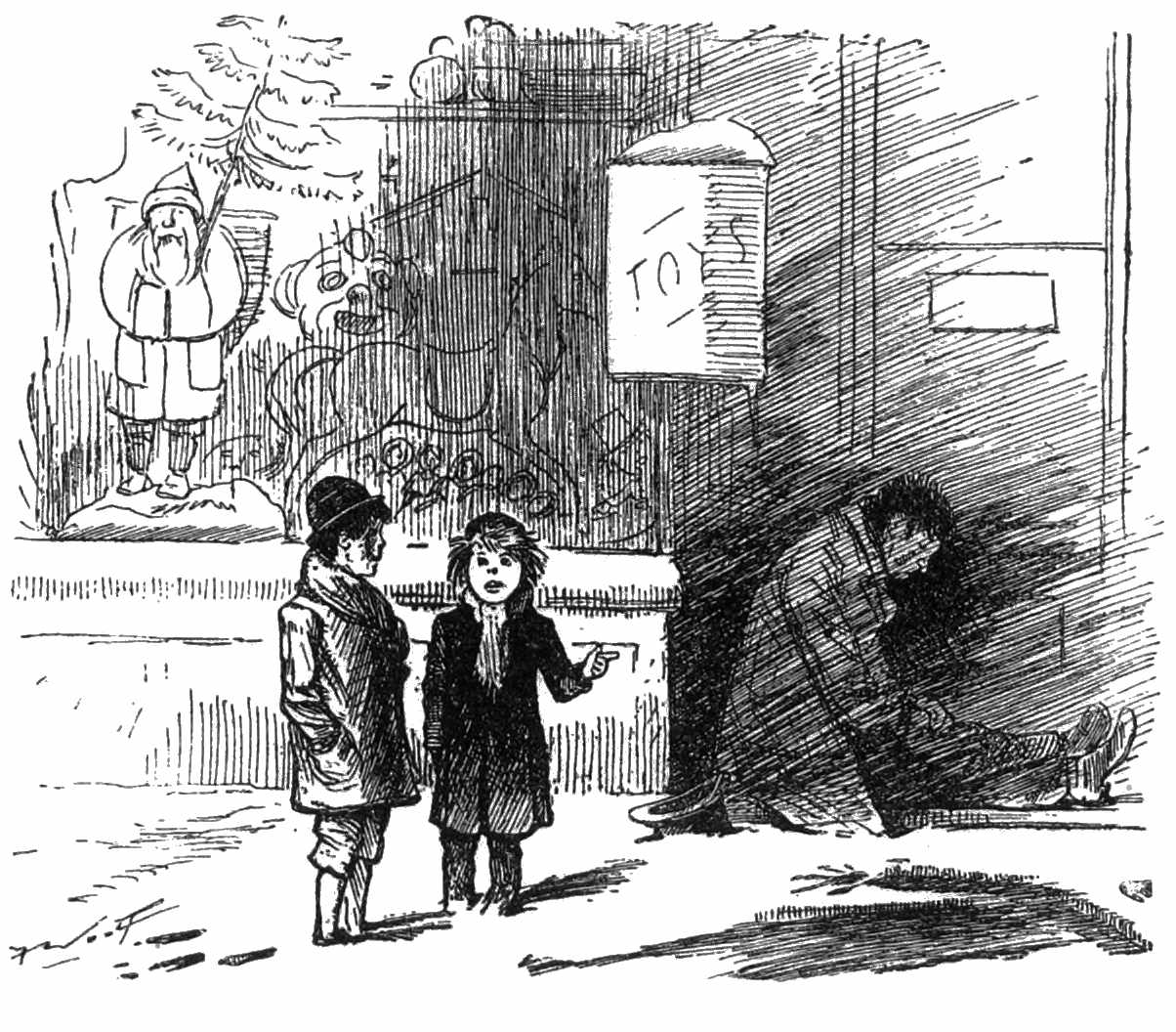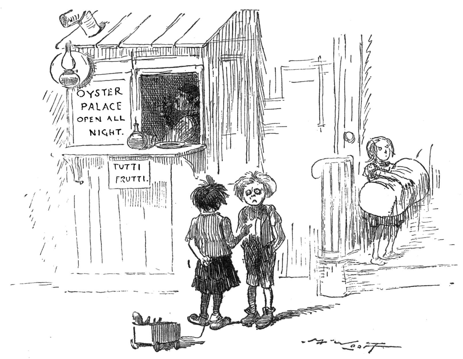 Em’ly: “Yer see I wuz carried away on a yaller cloud into a big open blue place where there wuz nothin’ but dolls—blondes, bluenettes, niggers, an’ Chinese; and Santa Claus took me by the hand an’ led me up to one o’ the most beautifullest dolls I ever seen, all gold lace an’ spangles, an’ it could talk an’ sing, too. (In rapture): Oh, it wuz too loverly for anythink! An’ Santa Claus wuz just puttin’ it into my hands when I woked up!”