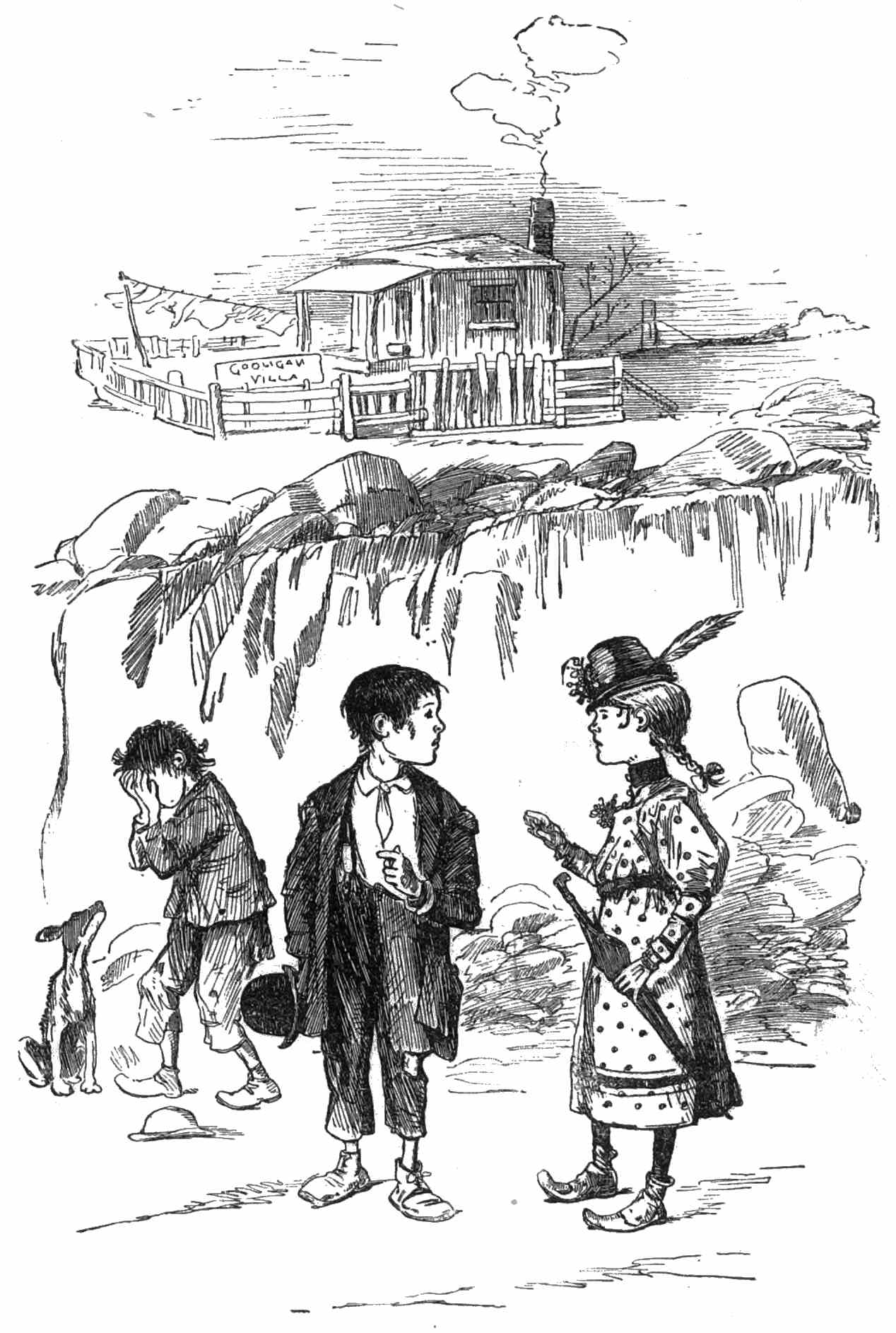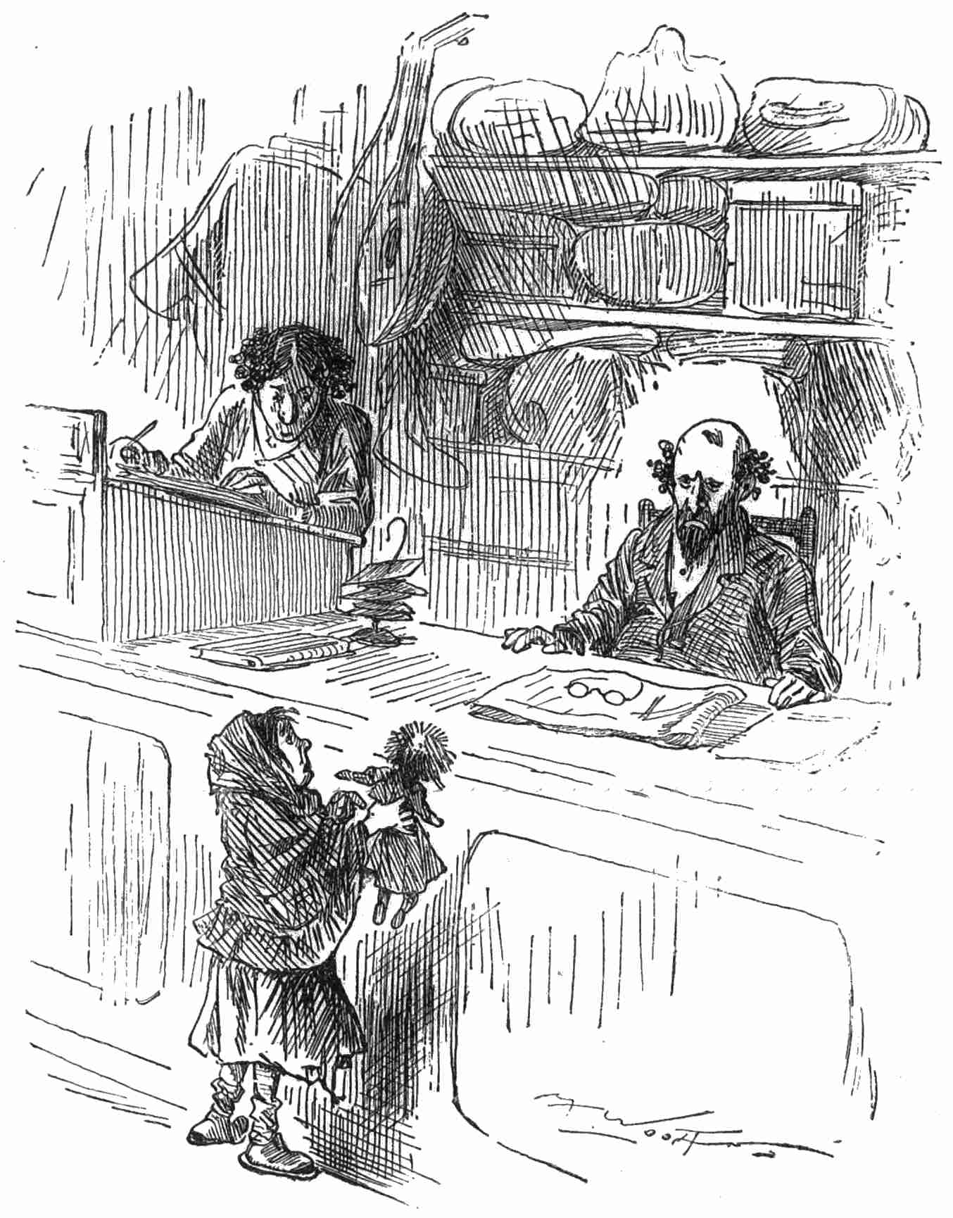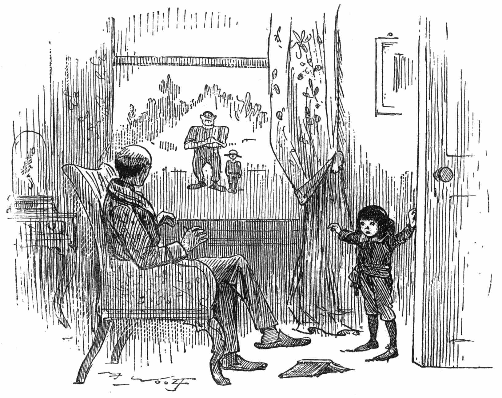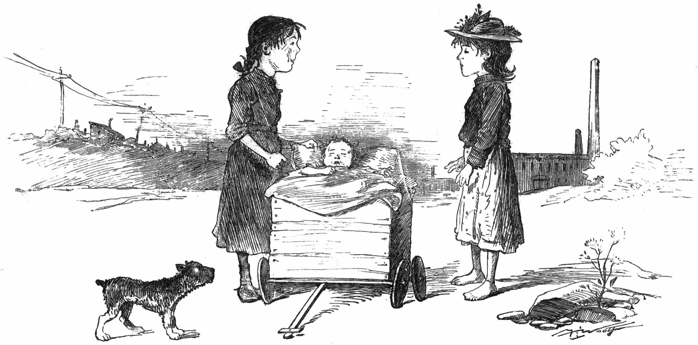 Em’ly: “Yer see I wuz carried away on a yaller cloud into a big open blue place where there wuz nothin’ but dolls—blondes, bluenettes, niggers, an’ Chinese; and Santa Claus took me by the hand an’ led me up to one o’ the most beautifullest dolls I ever seen, all gold lace an’ spangles, an’ it could talk an’ sing, too. (In rapture): Oh, it wuz too loverly for anythink! An’ Santa Claus wuz just puttin’ it into my hands when I woked up!”